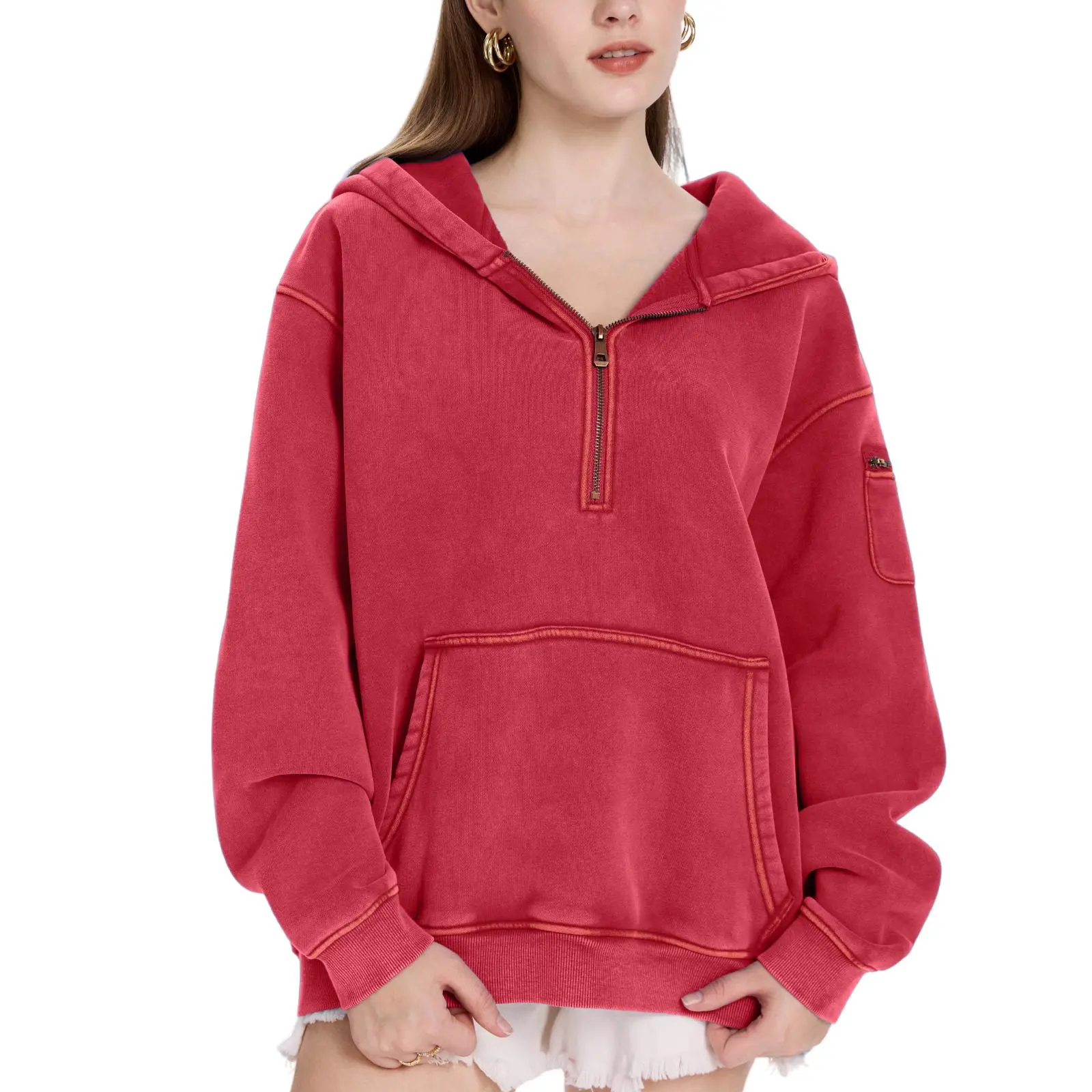 Features a contemporary half-zip design for adjustable style. This hoodie offers an on-trend oversized silhouette, ensuring a relaxed look for everyday wear. The soft, warm fleece fabric provides cozy insulation, perfect for chilly fall days and mild winter weather.