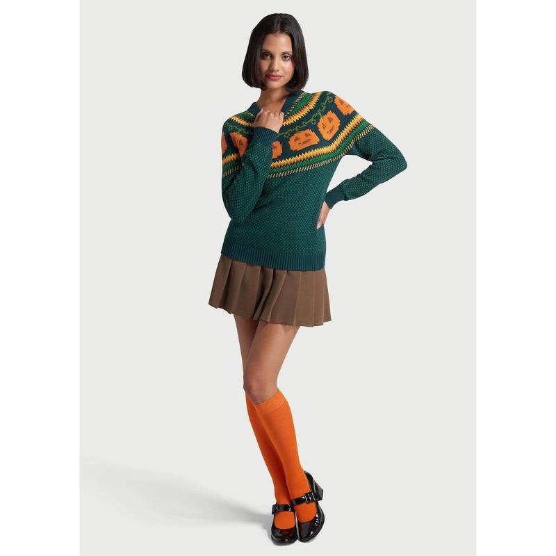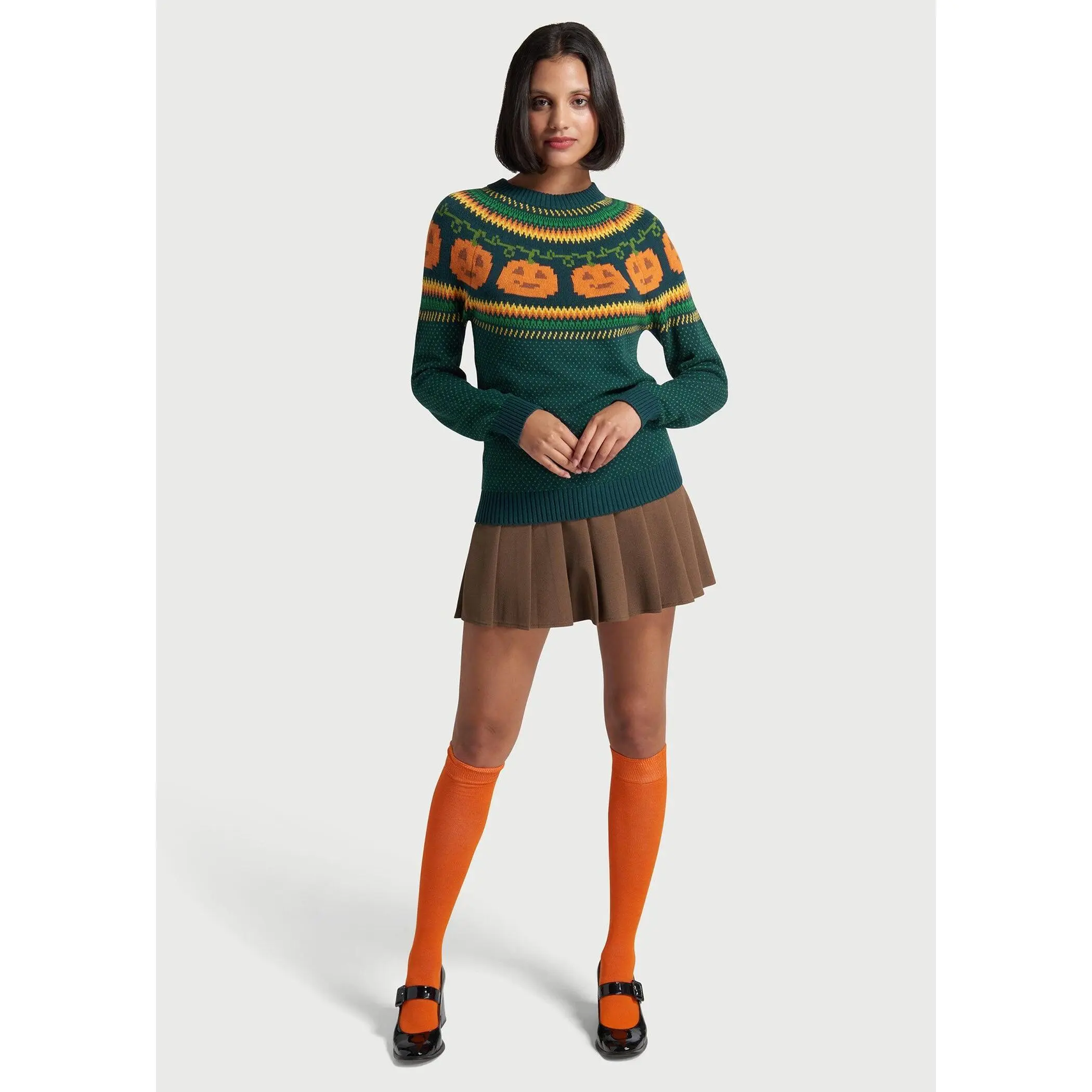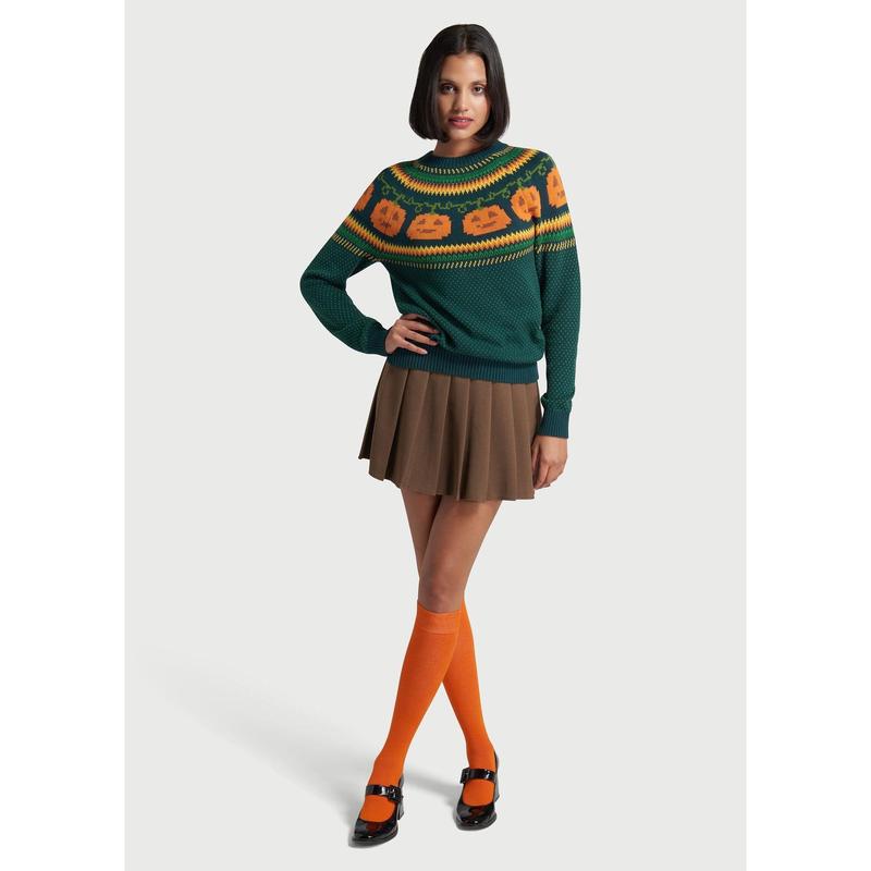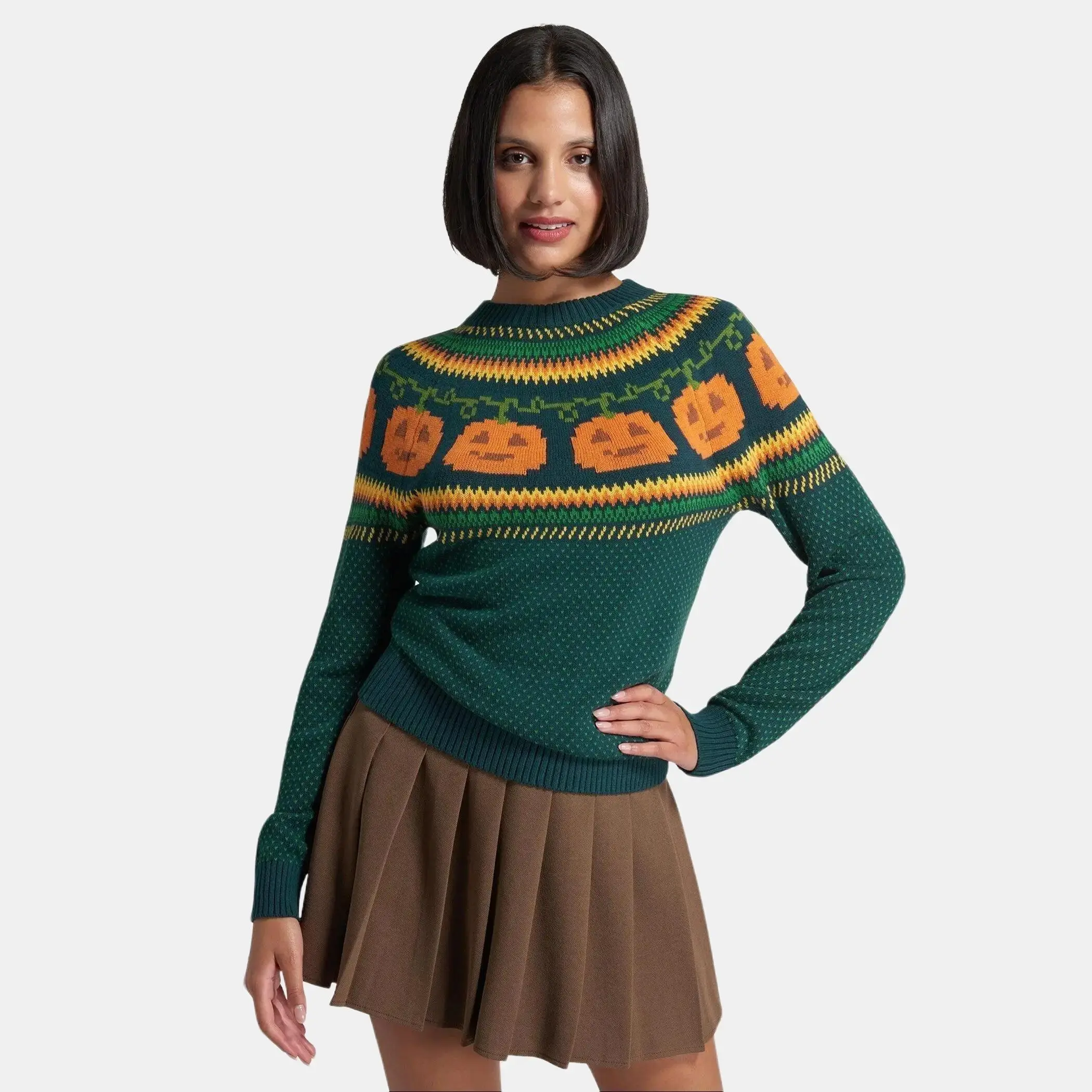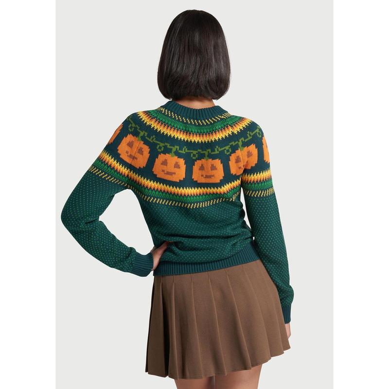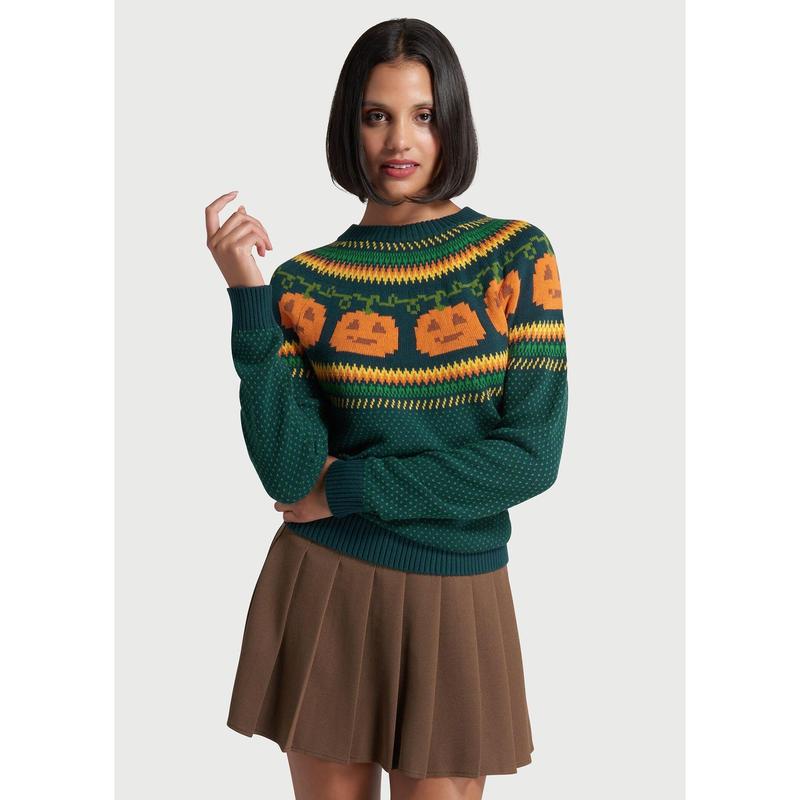 5. ModCloth Give 'Em Pumpkin To Talk About Fair Isle Sweater with Jack O Lantern Print - Green (XS-4X) Cotton Crewneck top Knit Long Sleeve pullover