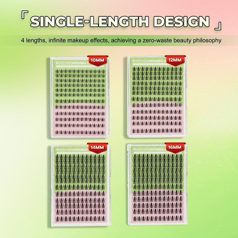 KEYYOU Fairy Single Length DlY Lash Cluster features an invisible band for a natural appearance. Perfect for beginners, these lashes offer a seamless look. Available in 10mm, 12mm, 14mm, and 16mm lengths, they provide versatile options. The D curl design ensures a flattering shape.
