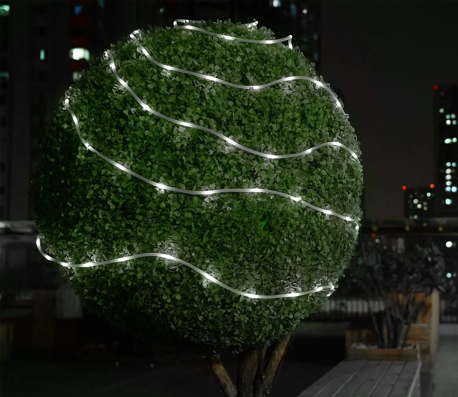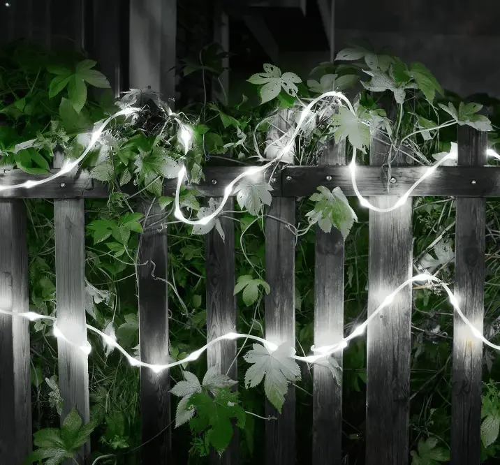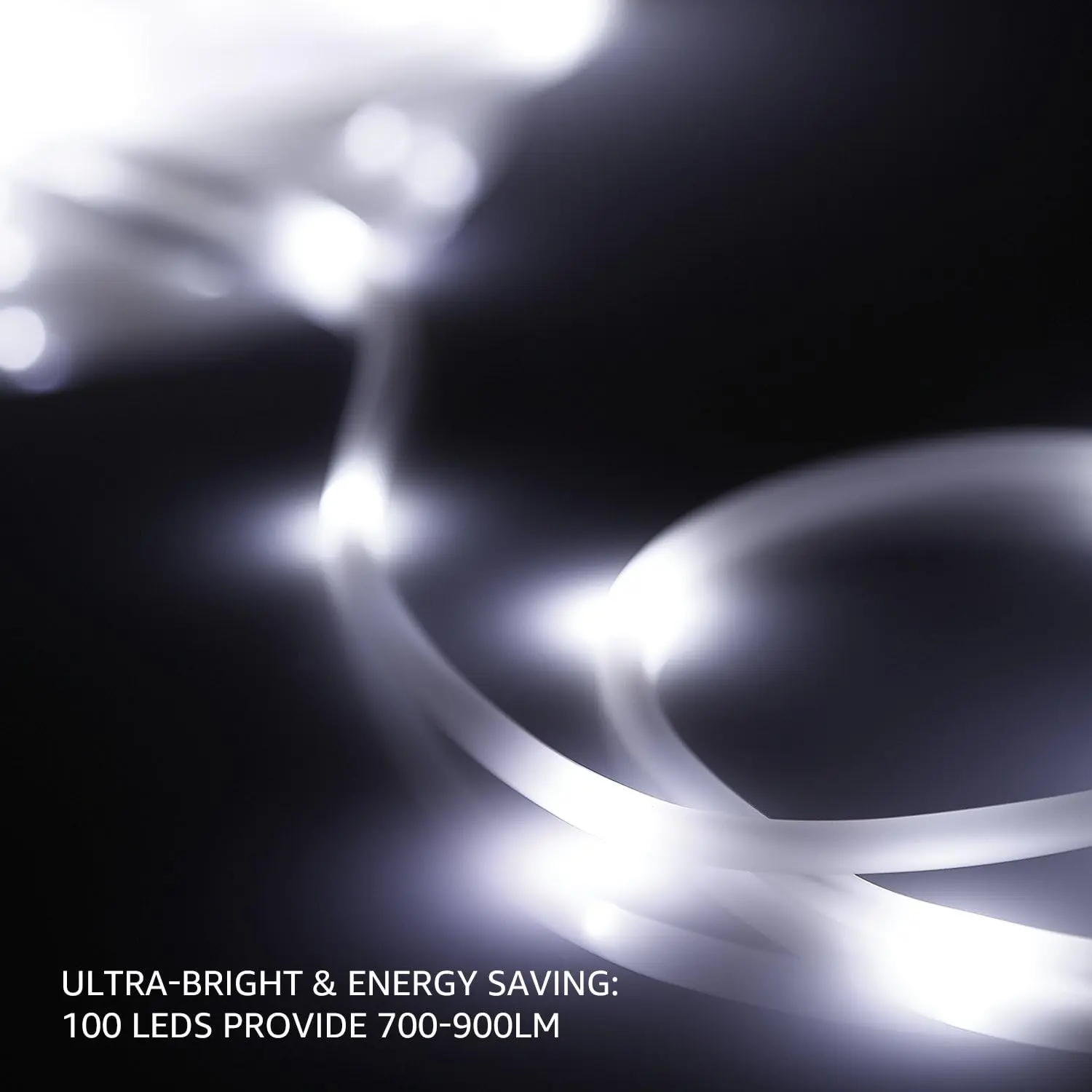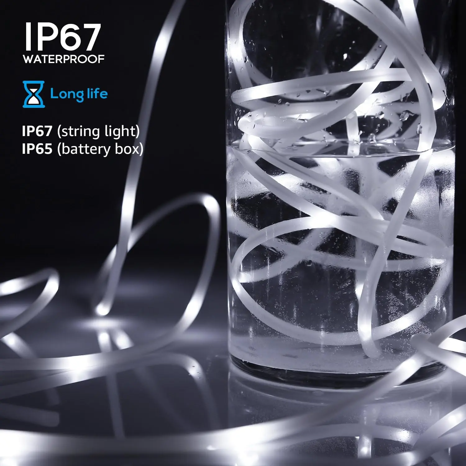 YuleGlow Fairy String Rope Lights with Remote Control is a battery-powered, 33 feet long light with 100 LEDs, offering waterproof features suitable for both indoor and outdoor use.