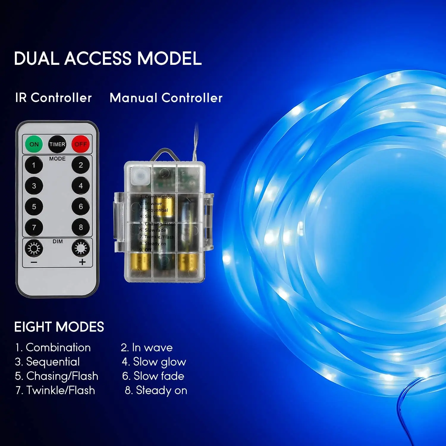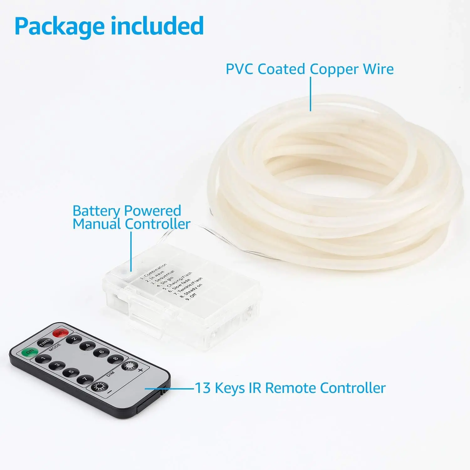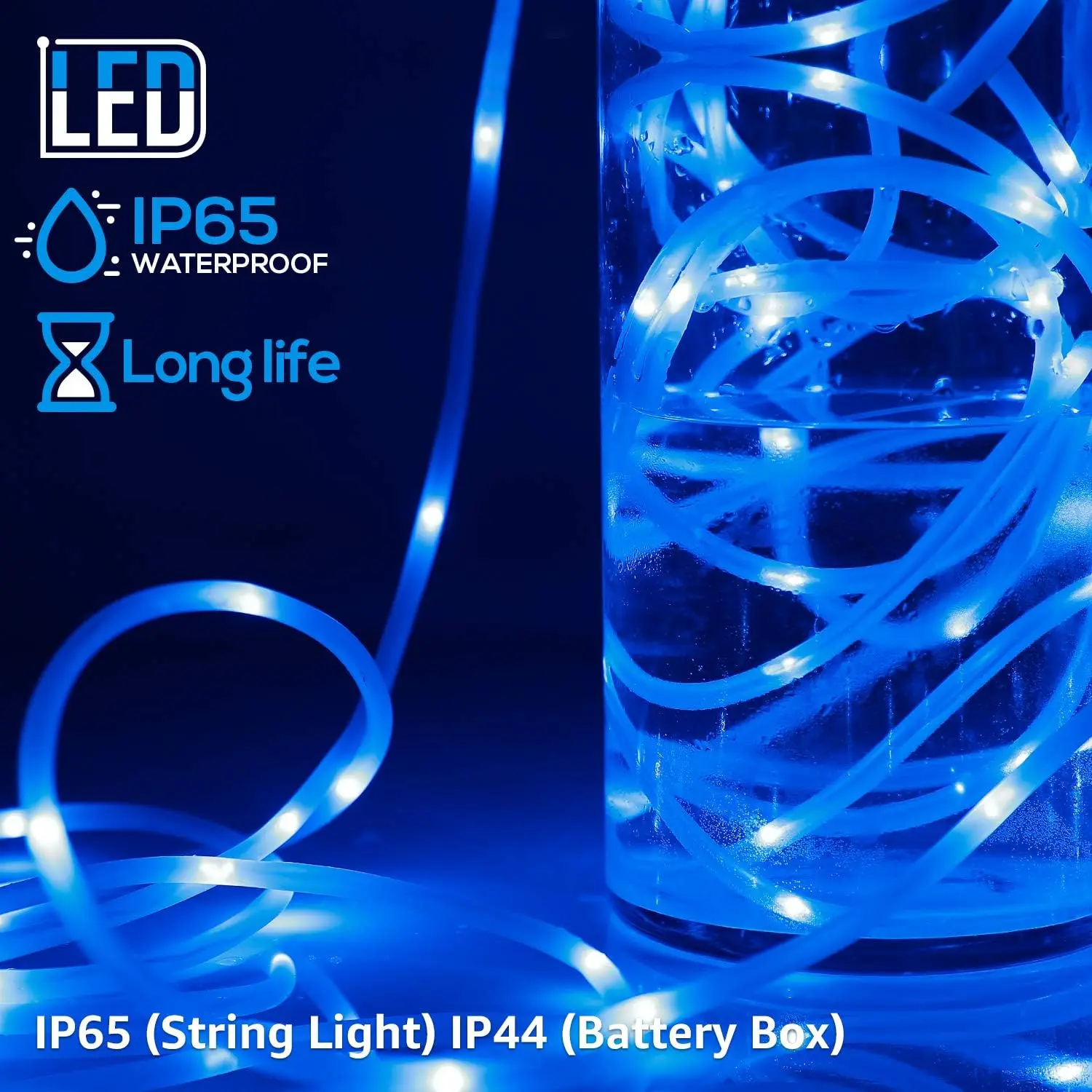 The YuleGlow Fairy String Rope Lights are a 5W, battery-powered, waterproof LED light designed for both indoor and outdoor use, emitting a blue hue perfect for Christmas, weddings, and birthdays.