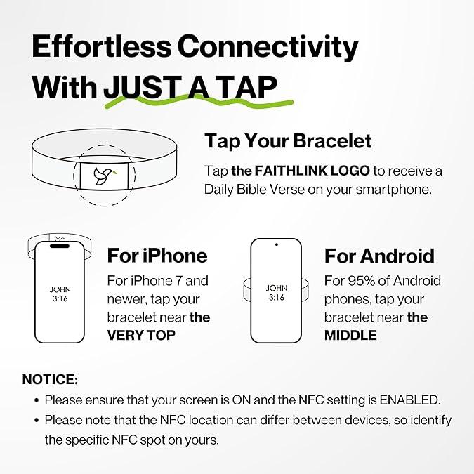 TAP INTO THE WORD - Compatible with 95% of smartphones,FaithLink bracelets make connecting with scripture effortless. Simply tap your scripture bracelet for your personalized daily Bible verse. No app is needed!