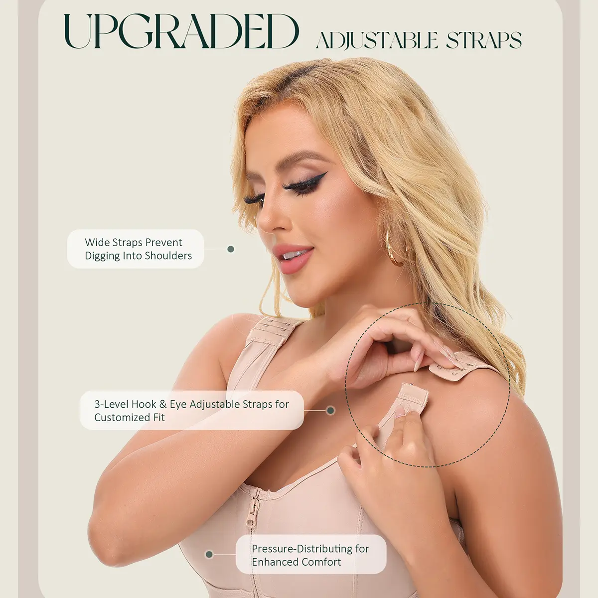 Designed to complement your fajas moldeadoras, Our wide, cushioned shoulder straps with a 3-row changeable catch & eye design offer a customized fit that contours to your body, preventing digging and distributing weight evenly for all-day comfort and support without strain or force points. The quick-pull zipper design ensures a snug fit at the crotch, avoiding gaps, and makes on/off easy—perfect for restroom breaks.