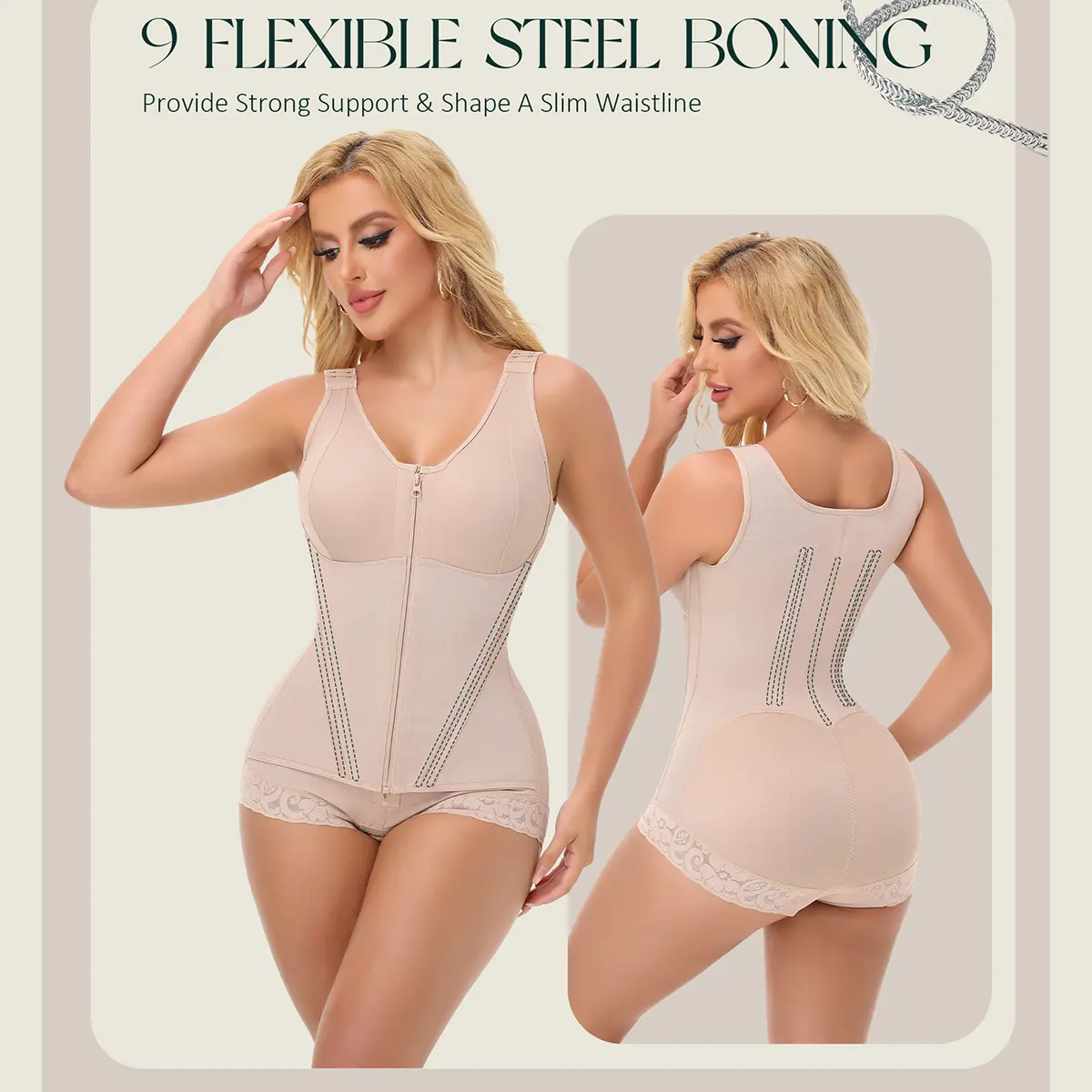 This faja body shaper features 9 stainless steel boning for support that perfectly fit the curves of the belly and waist. It can effectively tighten the excess fat in the waist, defining a firm waist, while providing strong support for the waist, helping to correct bad body shape and enhance the overall body line, which is a powerful assistant for body sculpting and beautification.