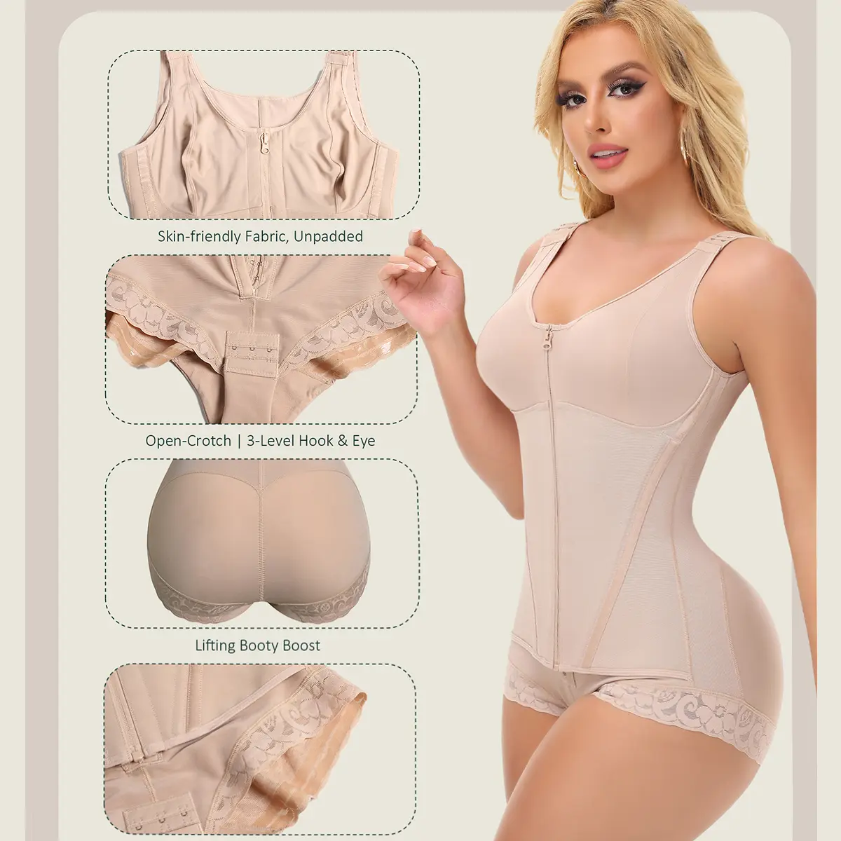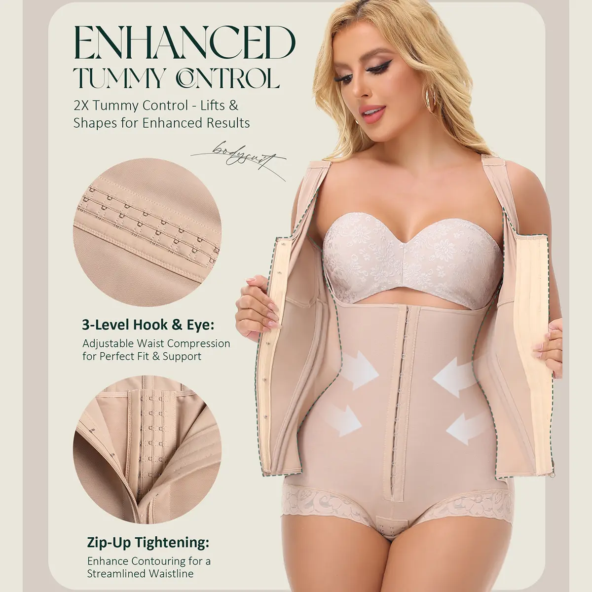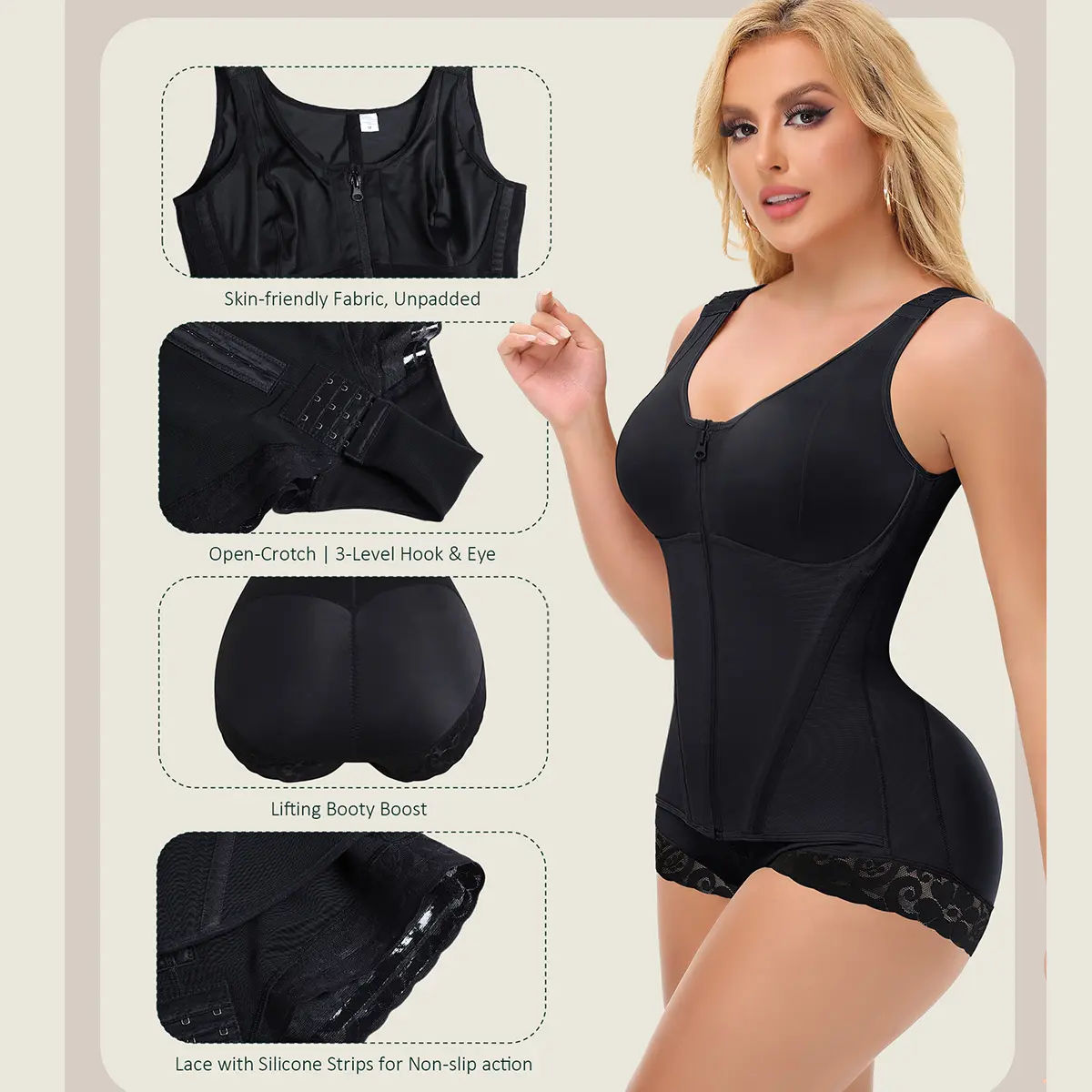 Designed with dual-power contraction, this full body faja for women defines your curves effortlessly. The inner layer's 3-level changeable catch & eye closure conforms to your body shape, providing customized Contraction that effectively flattens and smoothes your waist. The outer layer features an easy-zip design that delivers full contraction from waist to waist, for a perfectly sculpted silhouette. Perfect for post-surgery, or everyday.