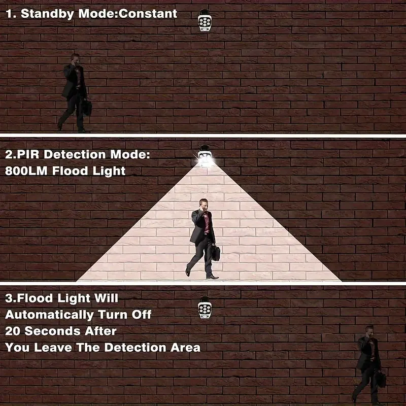 ·Auto Shut-Off: The floodlight automatically turns off 20 seconds after you leave, saving energy.