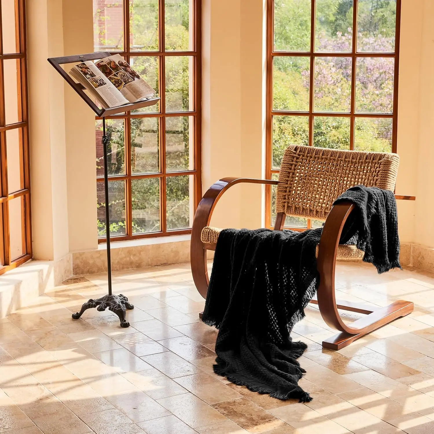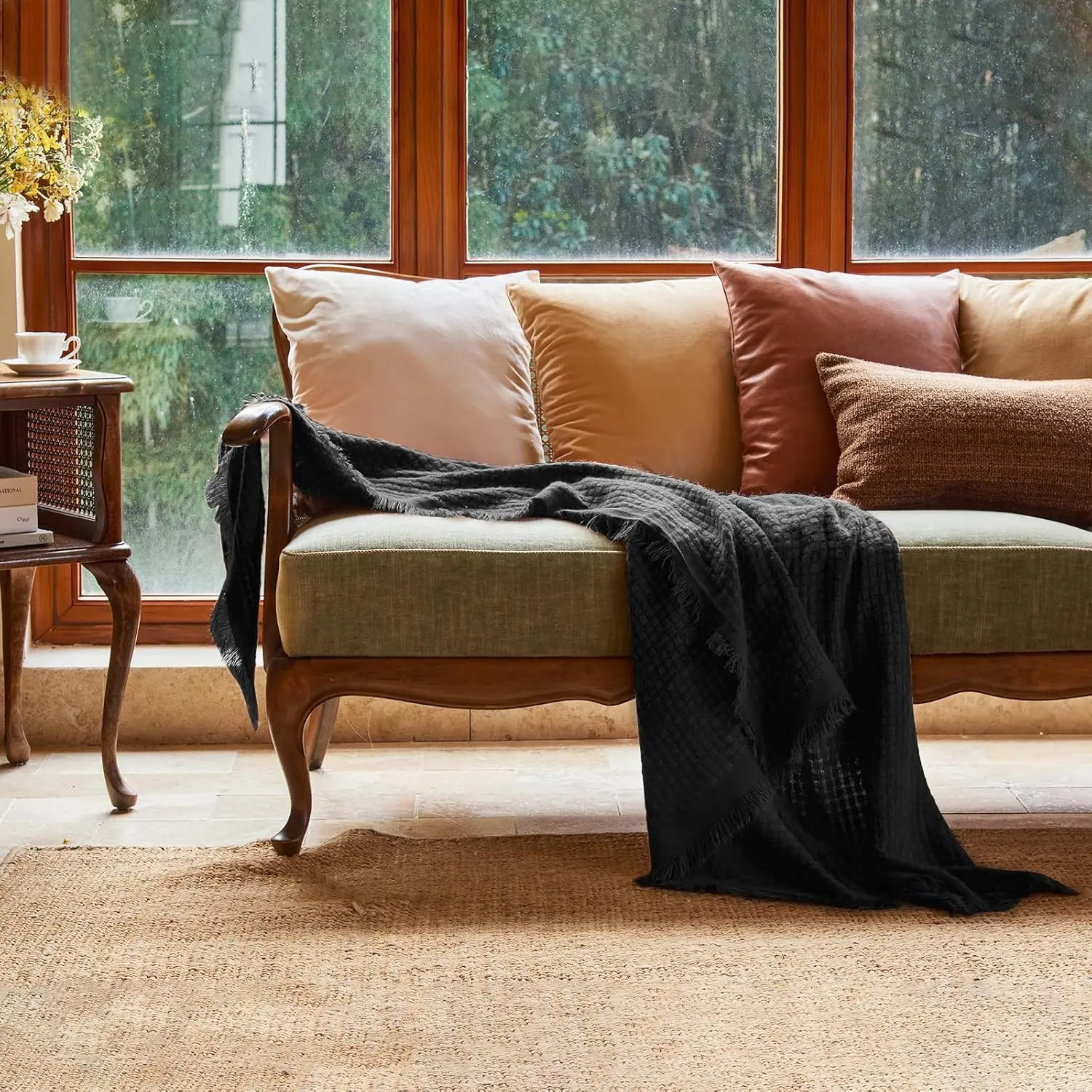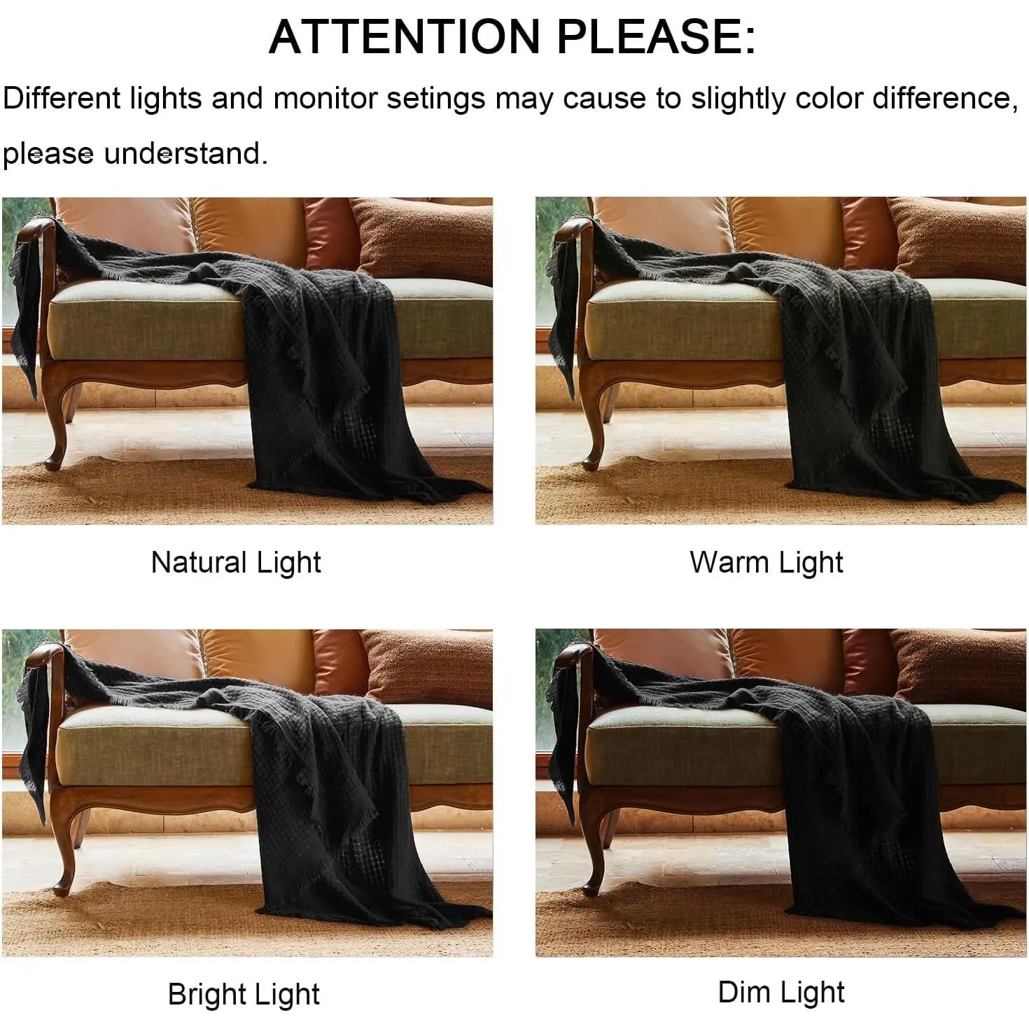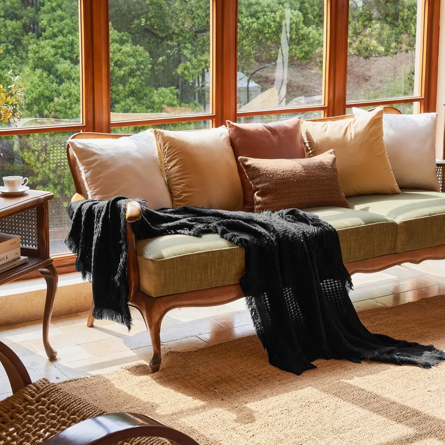 【FANTASTICAL DESGIN】 throw blanket for couch nicely raised waffle textured knit design and well-arranged rustic farmhouse style fringes, this knitted throw blanket is in black, which is a pretty easy way to match your room to add an extra solid black boho feature, don't you want have a black throw blanket or a terracotta throw blanket for your home decor?