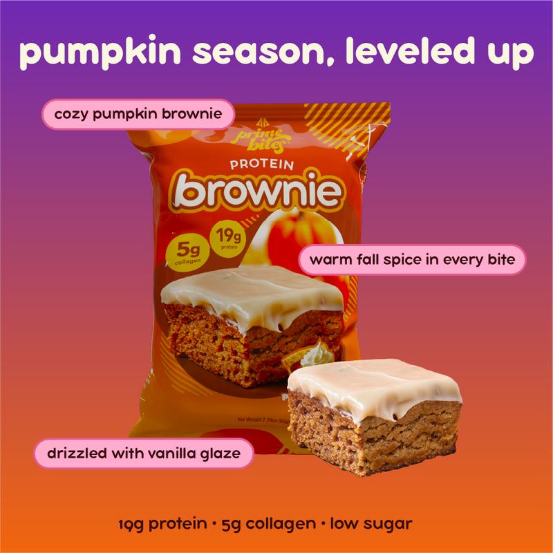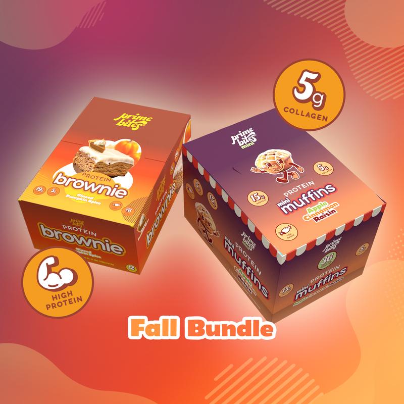 Indulge in cozy fall flavors with the Prime Bites Fall Bundle – Apple Cinnamon Raisin Mini Muffins + Pumpkin Spice Protein Brownies.