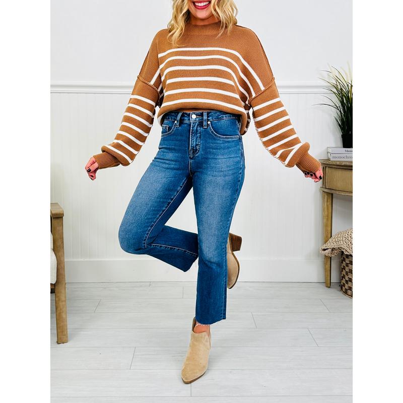We are falling fast for these new kick flare jeans that are a must have in your fall wardrobe for every occasion this season. These soft and stretchy jeans feature our viral tummy control panel that is guaranteed to give you a boost of confidence that you've never experienced before. These have a flattering silhouette with a subtle cropped flare that's perfect and trendy to pair with your favorite fall booties.