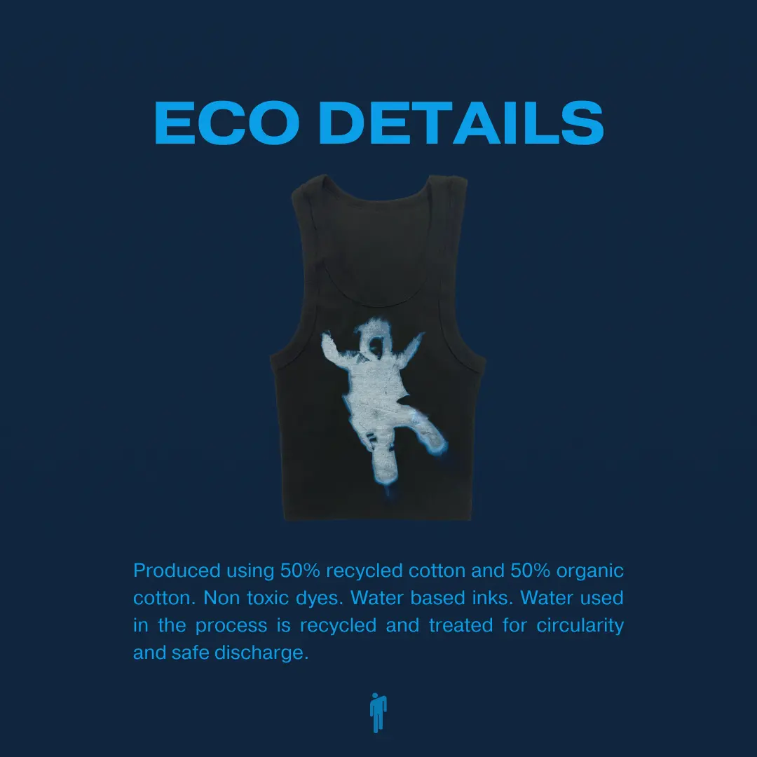 Produced using 50% recycled cotton and 50% organic cotton Non toxic dyes Water based inks Water used in the process is recycled and treated for circularity and safe discharge