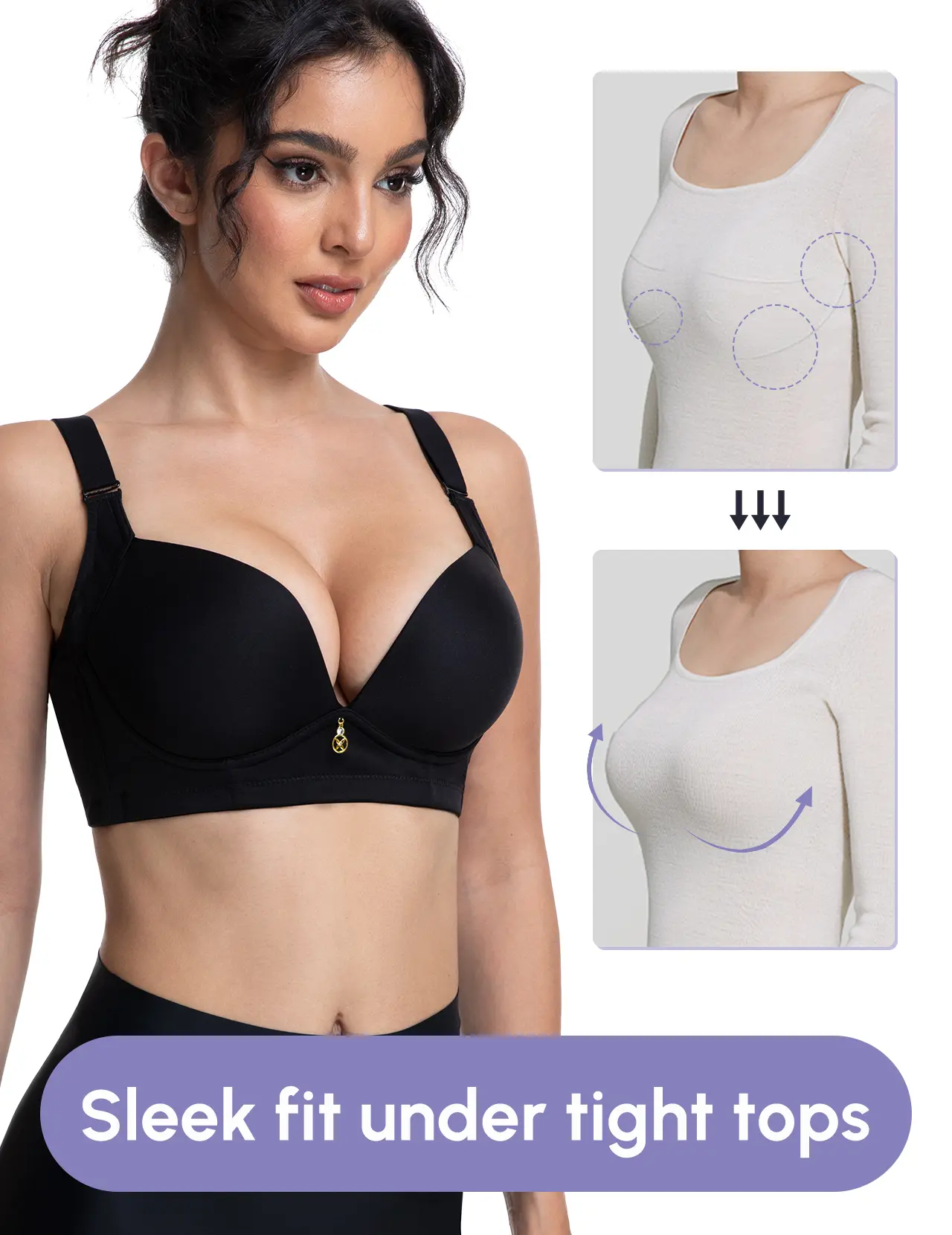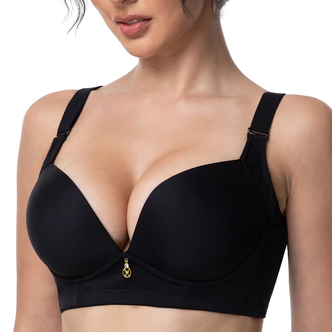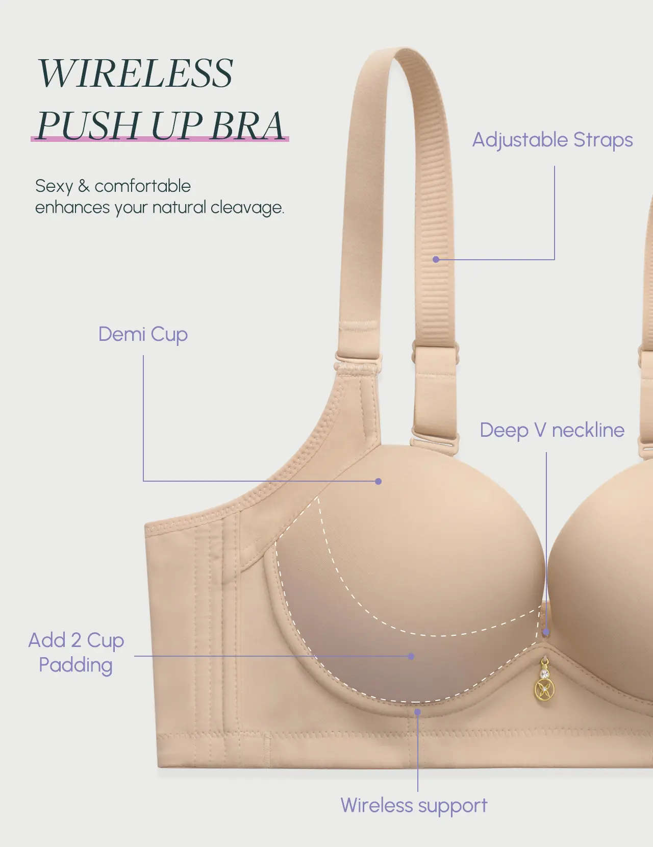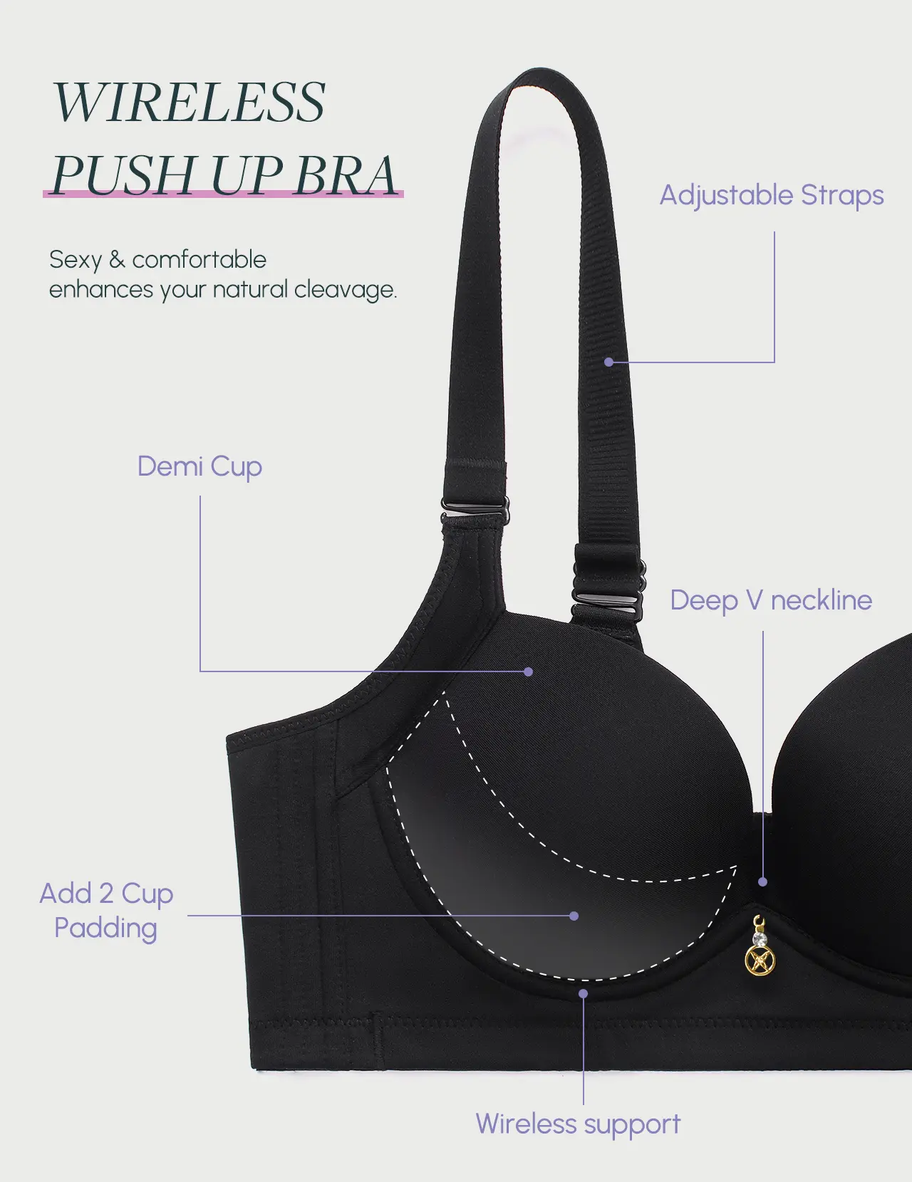 I had high hopes for this bra, but it fell short in every way! The seams are coming apart, charm off in package, the material is very thin, making it look/feel cheap, it makes my boobs look misshapen, and no matter how I try, I cannot get the straps into a decent position. Very uncomfortable.