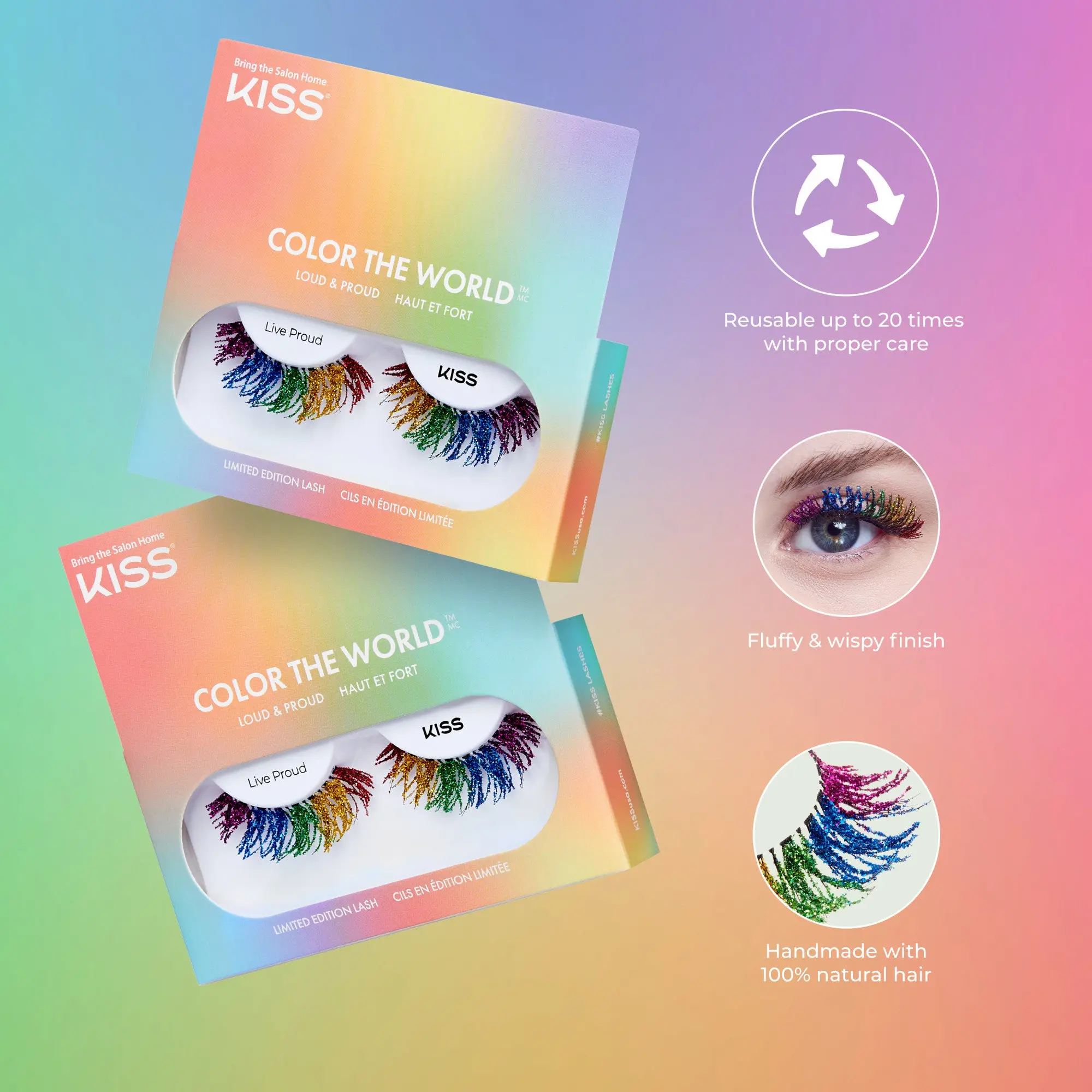 KISS is celebrating Pride Month with our specially designed pride lashes and by proudly supporting the Trevor Project. These voluminous false eyelashes are available in 3 outrageous styles, each with their own dramatic and colorful look.