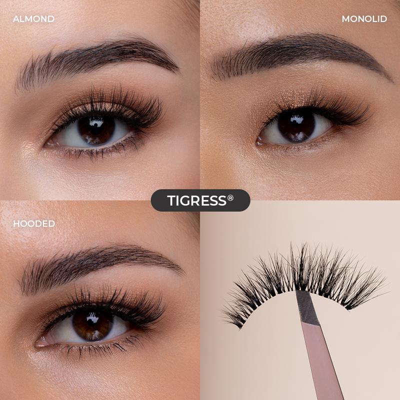 Tigress is part of our bestselling Feline Collection — a range of cat-eye lashes designed with our innovative Jelly Band technology. Unlike traditional stiff lash bands, the Jelly Band is made from a soft, gel-like material that literally molds to the shape of YOUR eyelid. The result? A custom fit that feels like nothing and stays put all day.