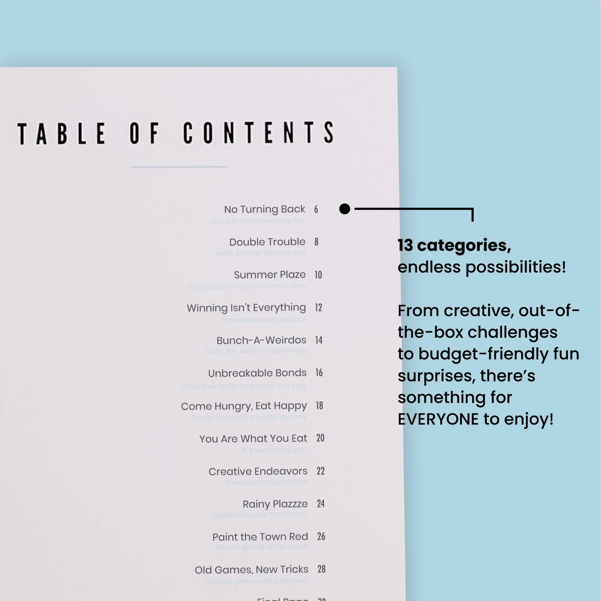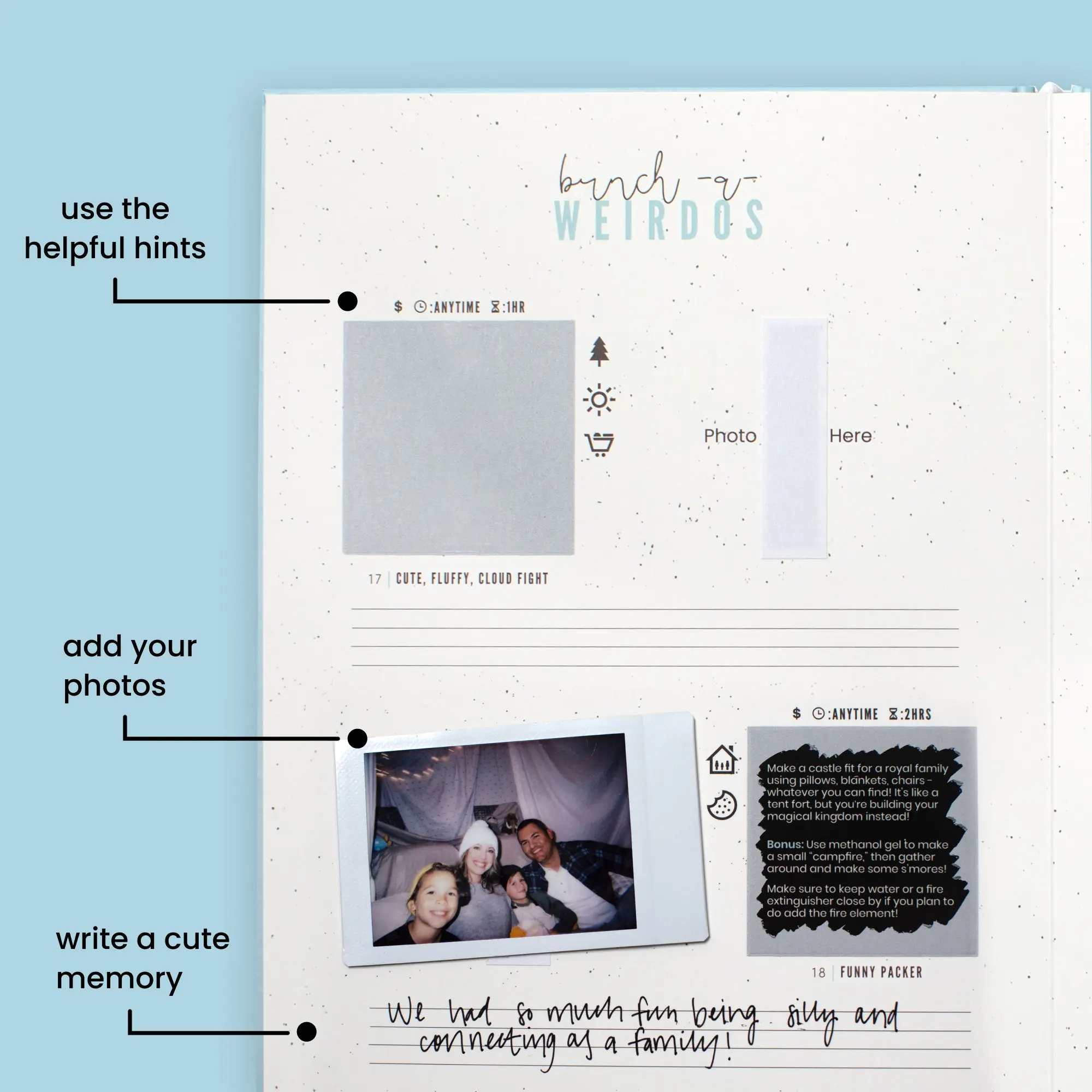 I purchased this book as a Christmas gift for my family. It is really important that even though my marriage did not work, that my ex and I still do things as a family. This is a great way for us all to still connect and have a great time. We have been having a blast with the challenges and my kids are loving it as well. Such a great idea!