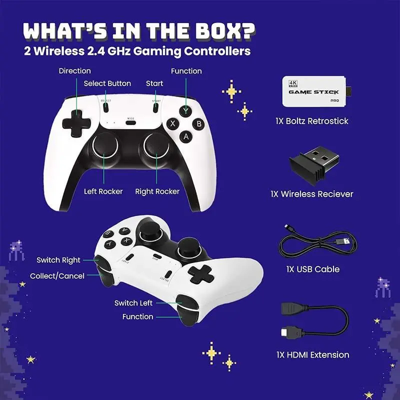 Amazing system! I connected it to my projector and it looks awesome. Playing these classic games really brings out the inner child. It comes with two controllers — just make sure to grab some AA batteries before you start.