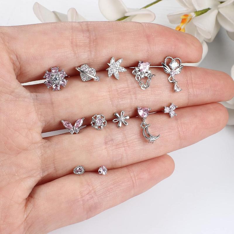 5. Fansilver 12PCS 20G Nose Rings Surgical Stainless Steel L Shaped Nose Studs for Women Men CZ Heart Butterfly Flower Leaf Moon Dangle Cute Nose Piercings Studs Screw Jewelry Pink