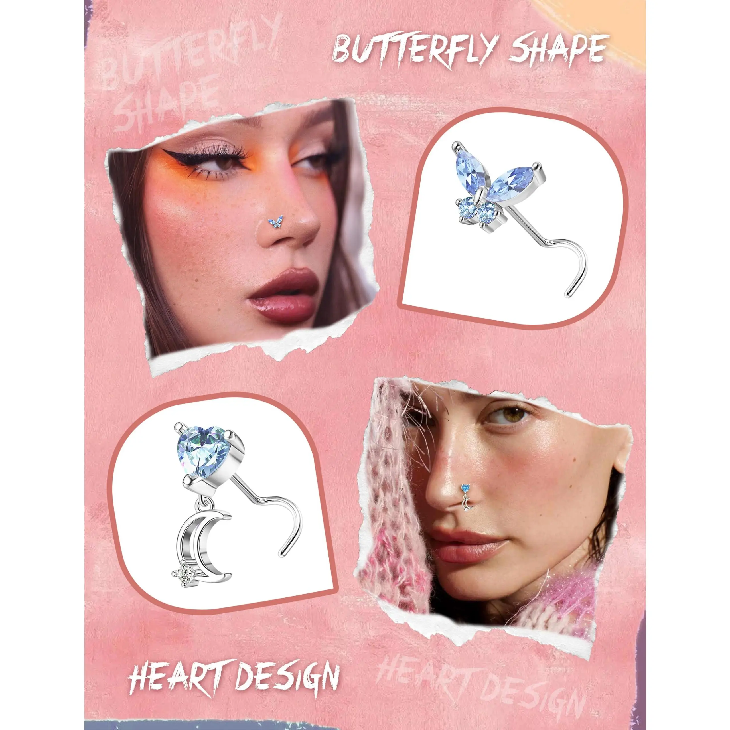 Elevate your style with Fansilver's 12PCS 20G Nose Rings. Crafted from surgical stainless steel, these L-shaped nose studs are perfect for both women and men. Each set includes a variety of designs: CZ Heart, Butterfly, Flower, Leaf, and Moon. These cute nose piercings add a touch of elegance to any outfit. 🌸