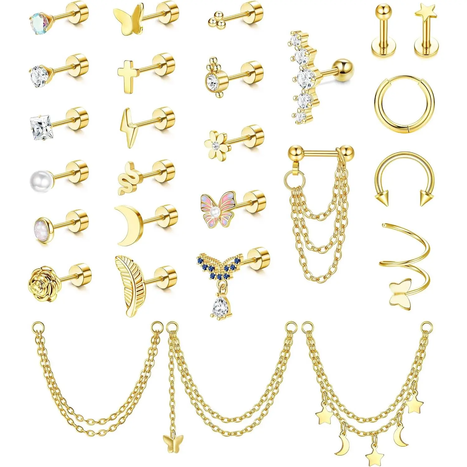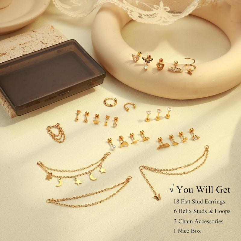 ·16G Cartilage Earrings Set: One package includes 27 pcs surgical steel flat back earring studs hoops, such as simple & cute cartilage flat back stud earrings, shining chain dangle helix piercing jewelry,