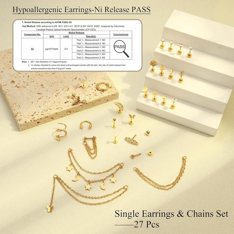 Fansilver 27Pcs Flat Back Earrings Hypoallergenic Surgical Steel Stud Earring Stacks Set Dainty Chain Dangle Cartilage Tragus Daith Helix Piercing Jewelry for Women Men Trendy 16G