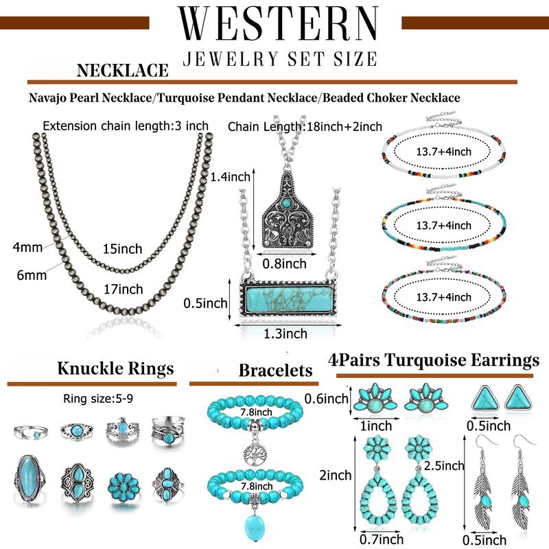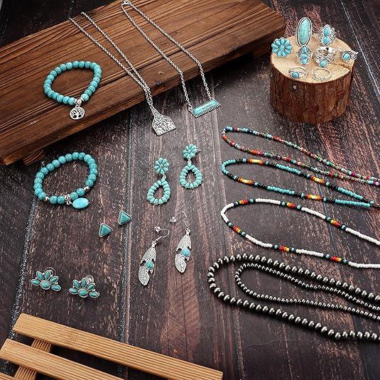 ·Variety of Pieces: This set includes 1 layered necklace with pearls, 2 western pendant necklaces, 3 beaded chokers, 2 stretchy bracelets with turquoise-like stones, 4 pairs of earrings with turquoise-like elements, and 8 vintage-inspired knuckle rings. Perfect for enhancing your western or boho look.