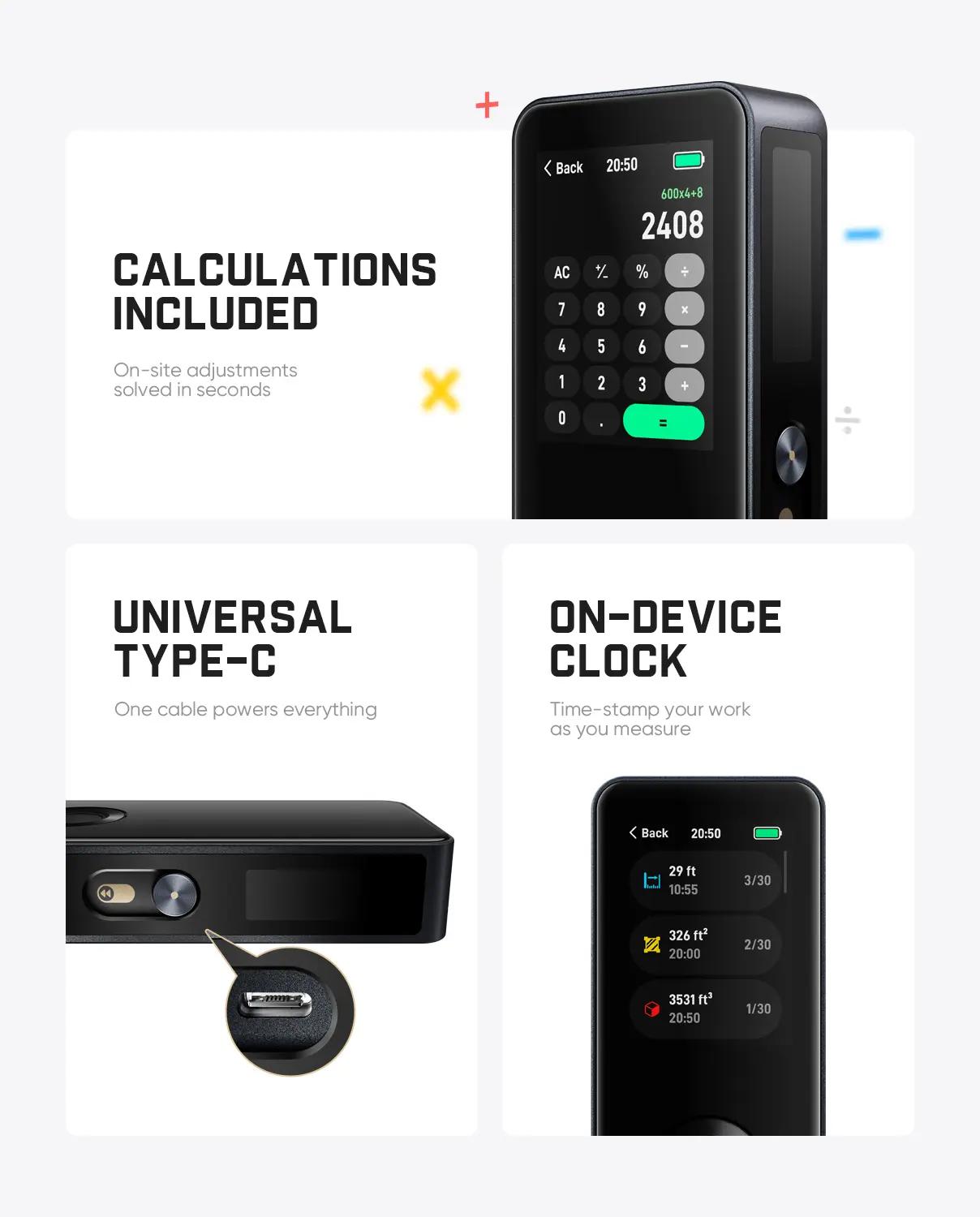 ·Dual Displays & IPS Touch Screen: This laser measuring tool with 2.4″ IPS touch main screen, 320×240 resolution, 500 nits, clear in bright light. The side LCD screen syncs horizontal angle and virtual ruler baseline. Touch settings combined with vibration feedback, intuitive UI, easy to use