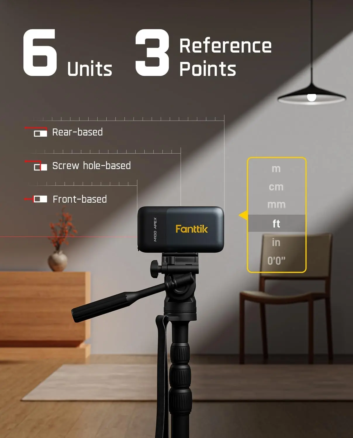 ·6 Units + 3 Modes + 3 References: The M100 supports 6 units (Ft/Ft+in/in/M/CM/mm), 3 modes (distance/area/volume), and 3 reference points (front/rear/screw hole). Its tripod-compatible design ensures stable projection and high-altitude positioning, delivering precise measurements in corners, ceilings, and other complex scenarios with flexible operation