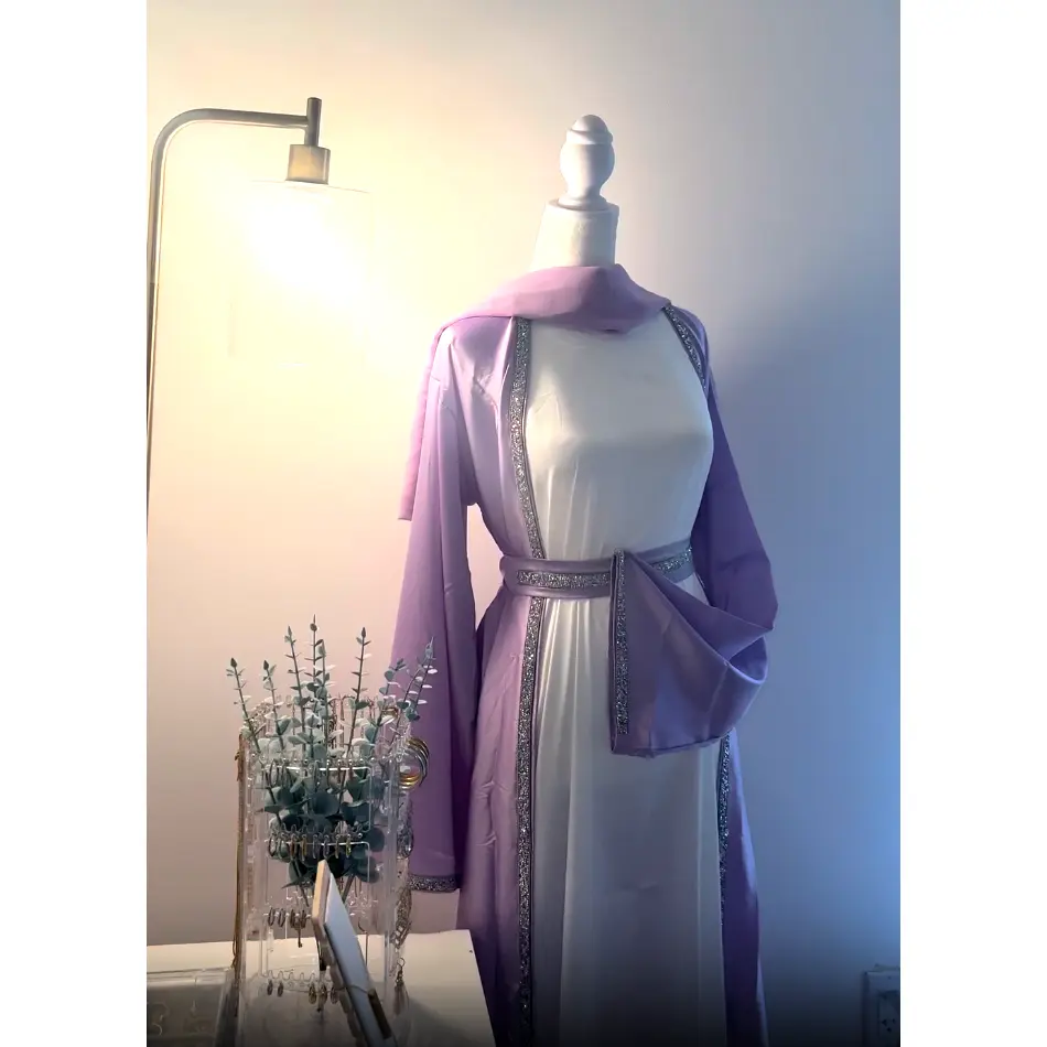 Our Purple and Turquoise Farha abayas now come with a beaded belt that can be worn both ways!
