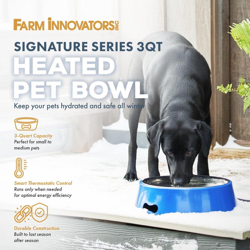 Keep your outdoor pets happy this winter with the Farm Innovators SB-40 Heated 3-Quart Water Bowl. Maintaining the warmth of your pet's drink is important to keep them hydrated during chilly days. This heated water bowl keeps your pet's water or food from freezing during cold winter months.The heated bowl features 40 watts of power, thermostatically controlled to automatically turn on and off depending on the temperature. No need to brave the cold to adjust any temperature setting, as the warmer does the work for you. With its 3-quart capacity, this outdoor heated water bowl is suitable for small to medium-sized dogs, and can be used across the farm for multiple pets and small livestock.This heated water bowl for dogs, cats, and other pet animals comes with a heavy-duty anti-chew metal cord protector to deter your pet from chewing through the power cord. This guard features guarantees that animals are safe from harm and the bowl's functionality willnot be damaged. Made from stainless steel, the electric powered water dish and feeder offers durability and reliability through the winter months or cold temperatures throughout the year.Whether you have barn cats, outside dogs, or other pets, make sure they have suffiecint water throughout the winter with the Farm Innovators P-Heated 3-Quart Pet Water Bowl.