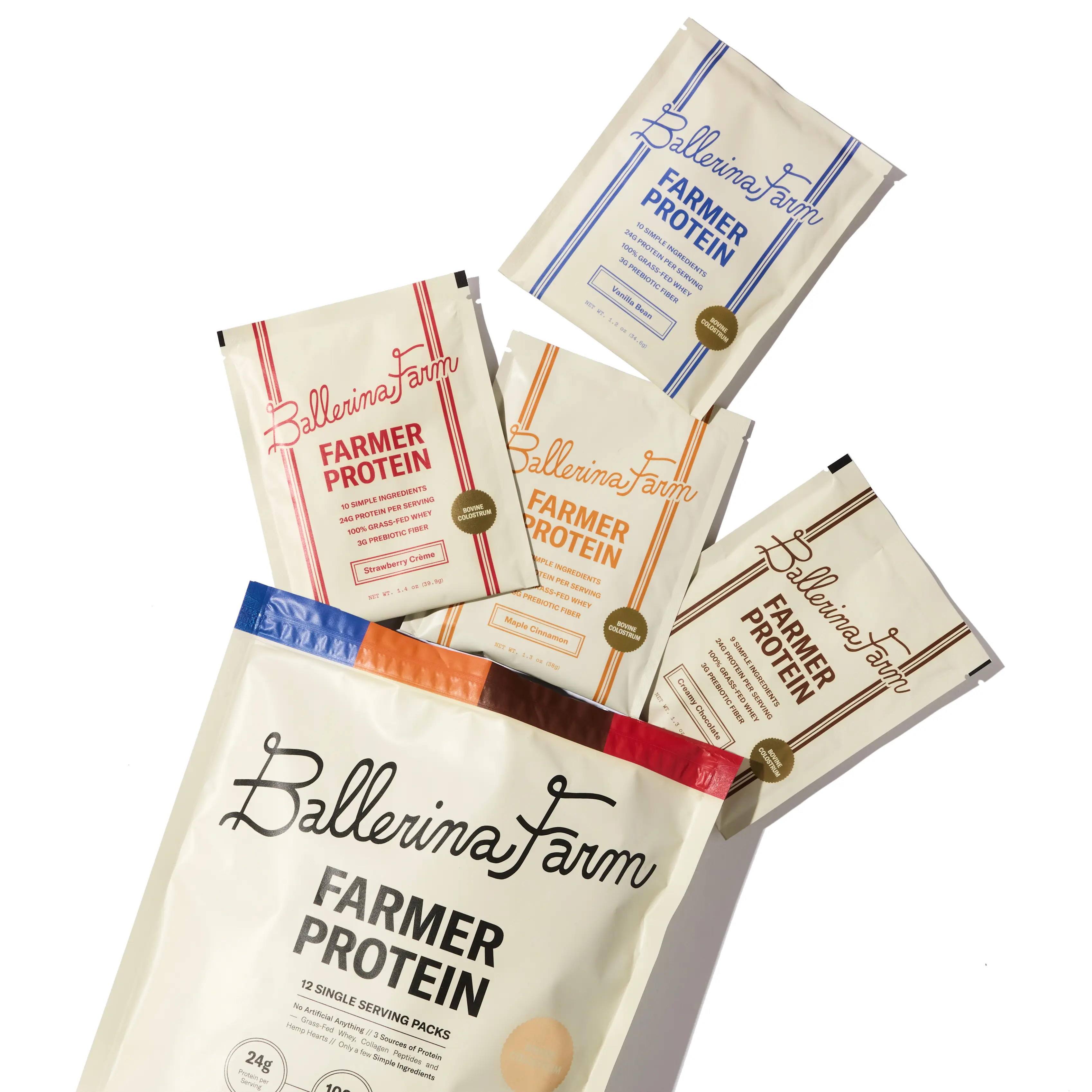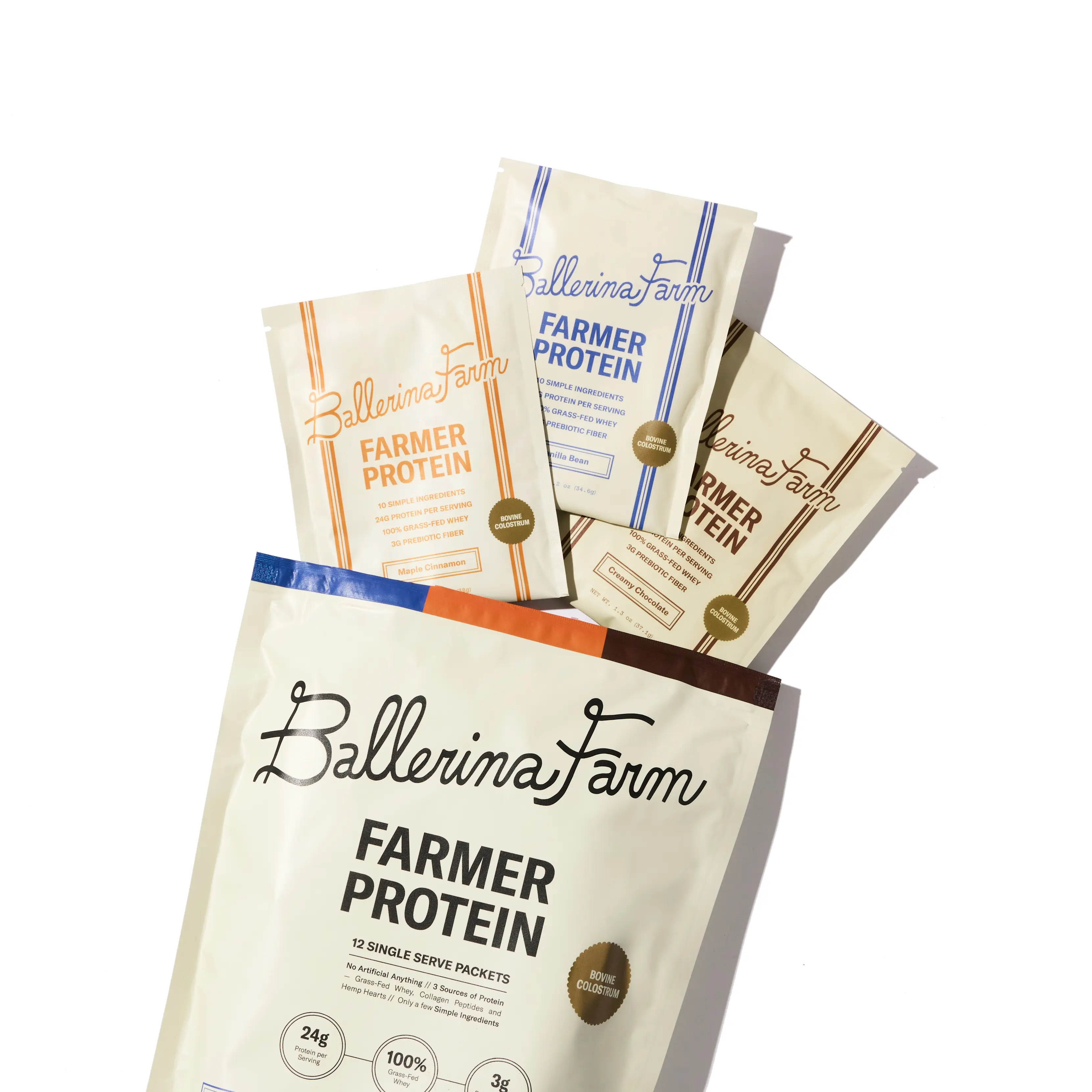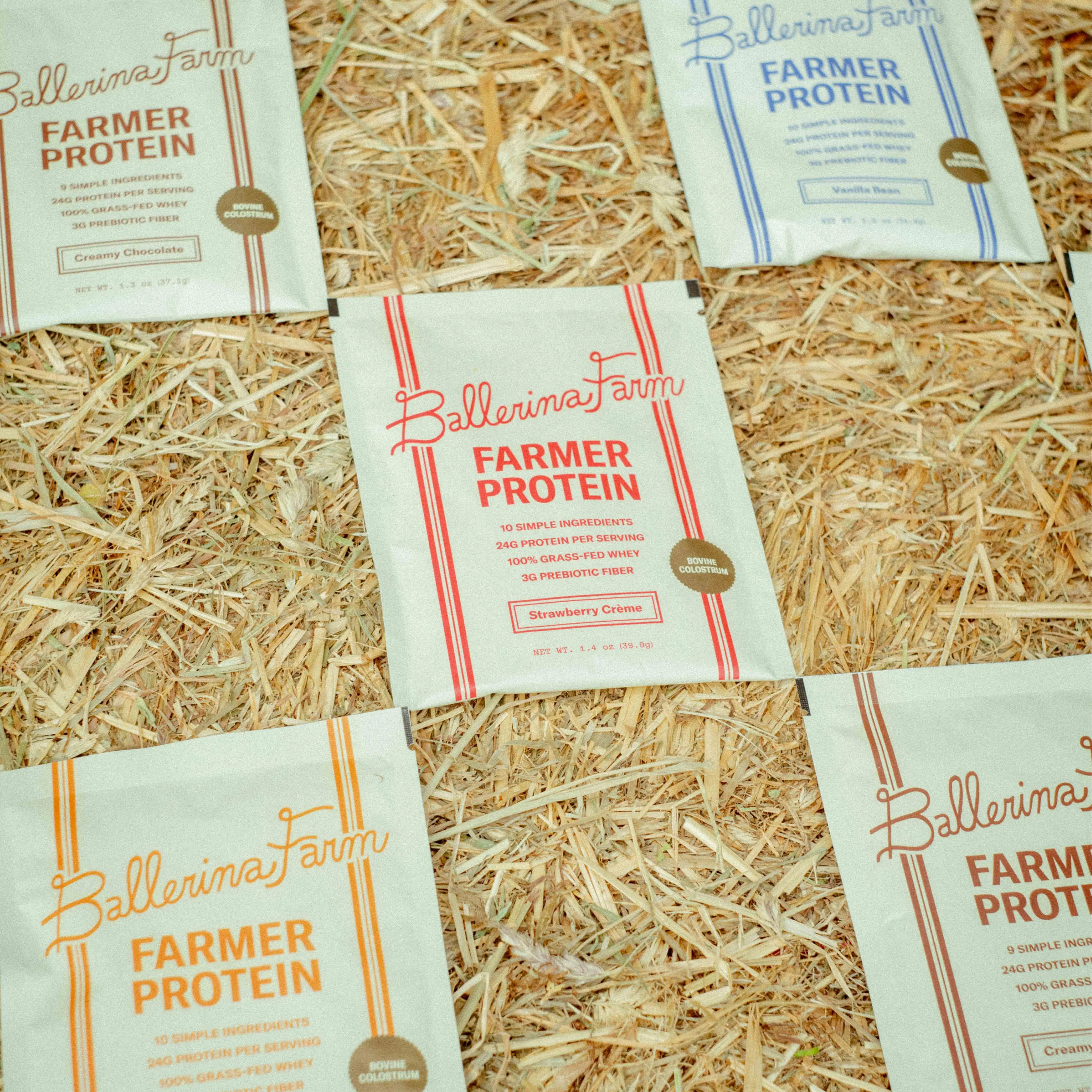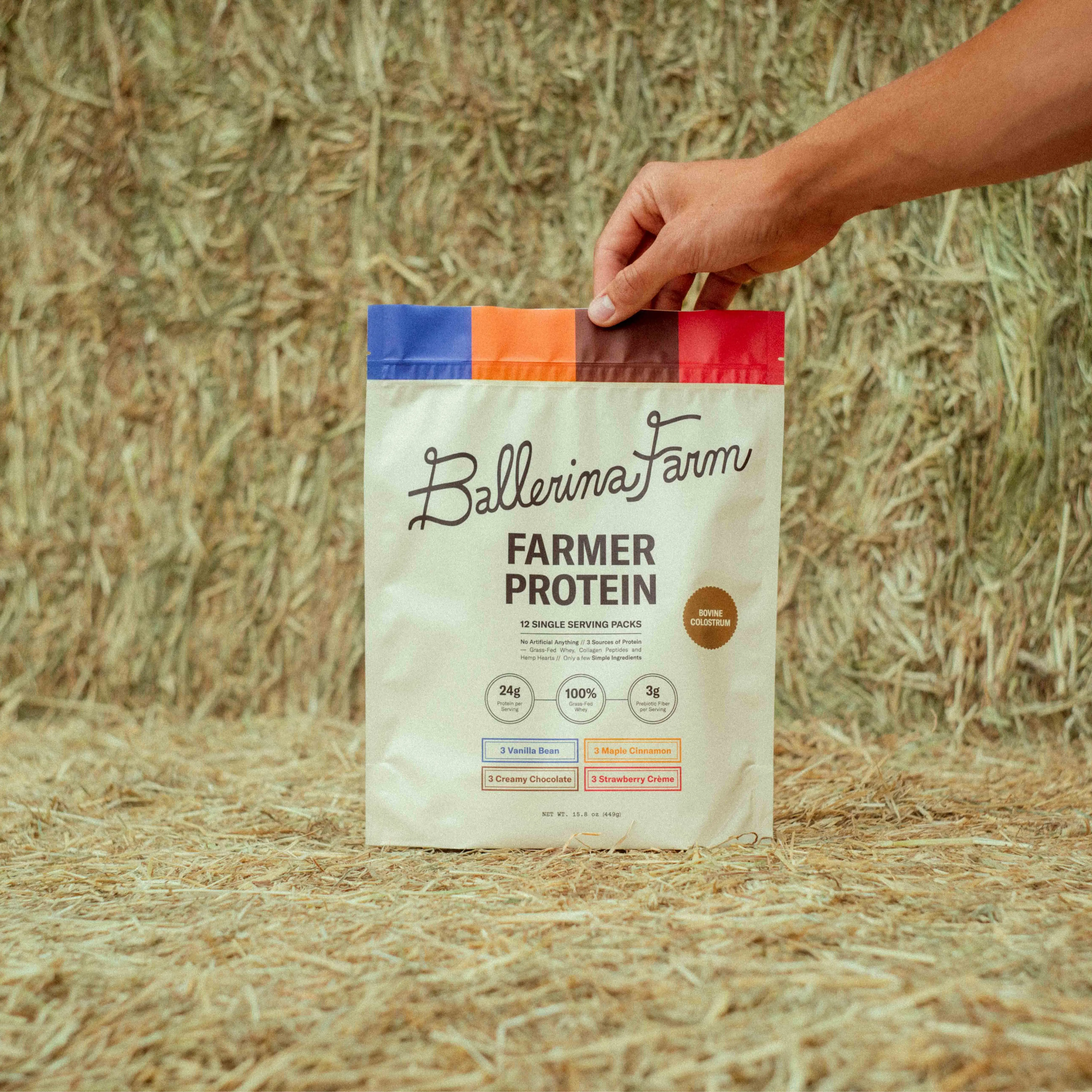Our Farmer Protein is a clean, nutrient-dense source of protein made from ingredients we trust and use in our own home. Each single-serve pouch contains 24 grams of protein from 100% grass-fed whey, collagen peptides, hemp protein, and calf-first bovine colostrum.