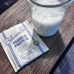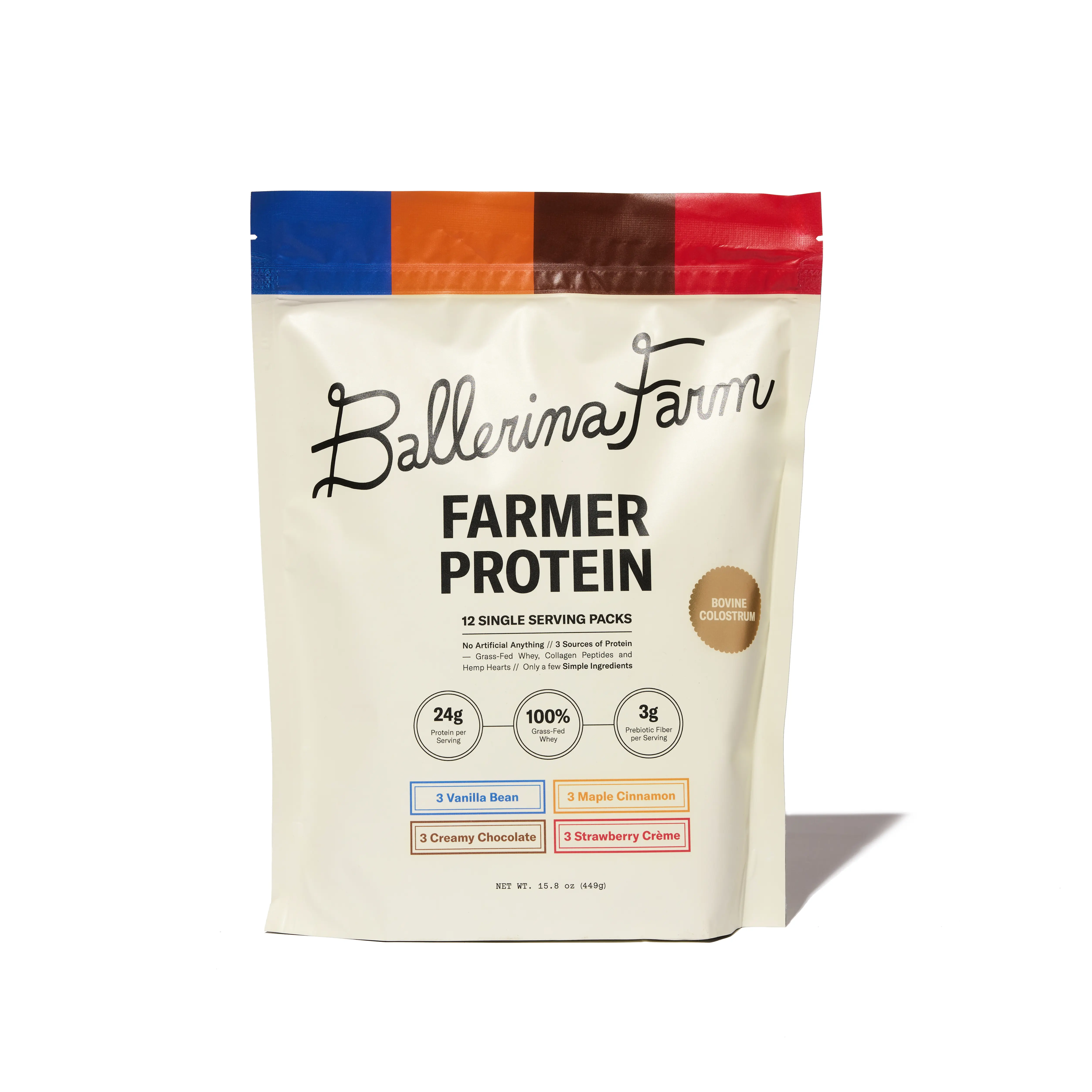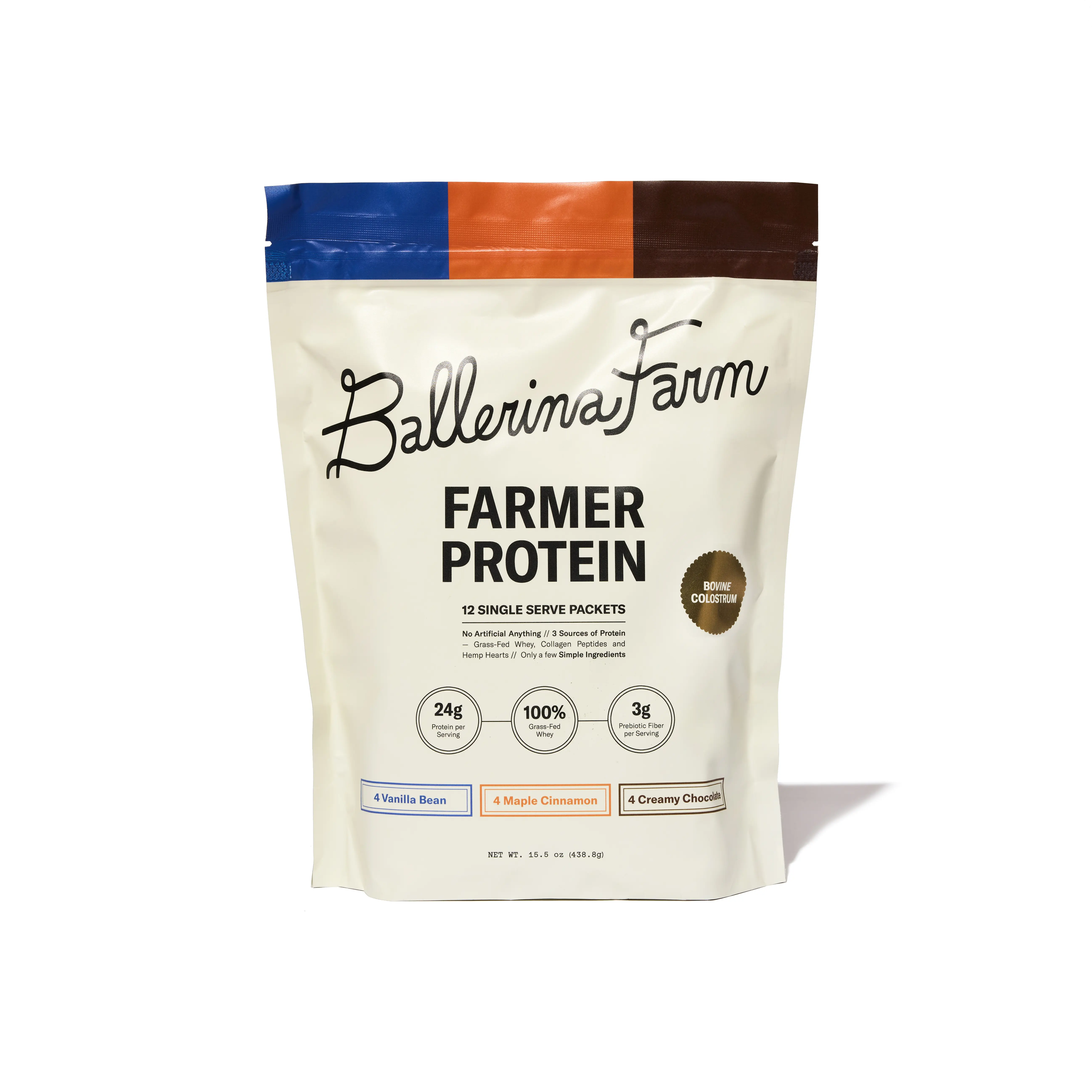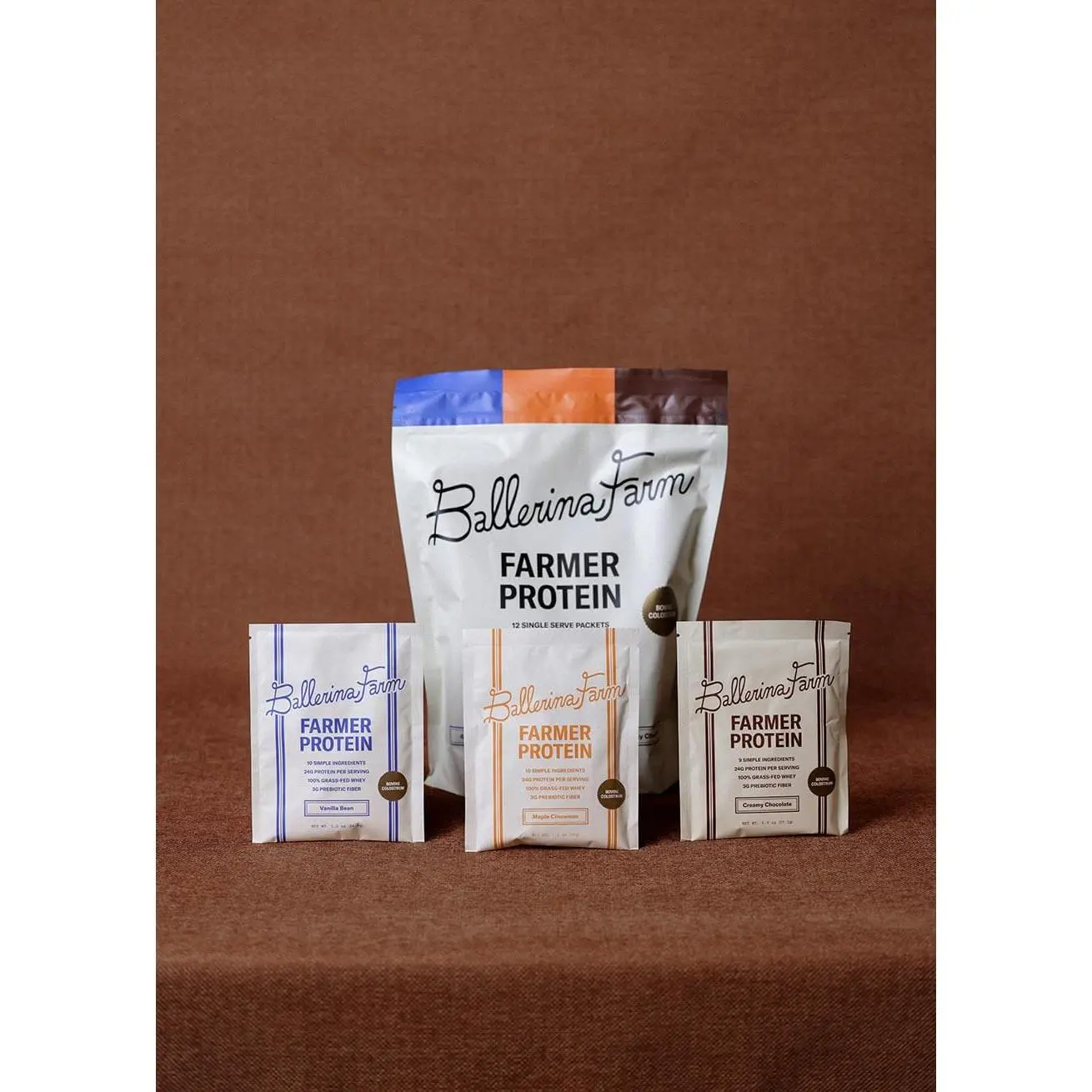 Our Farmer Protein is a clean, nutrient-dense source of protein made from ingredients we trust and use in our own home. Each single-serve pouch contains 24 grams of protein from 100% grass-fed whey, collagen peptides, hemp protein, and calf-first bovine colostrum.