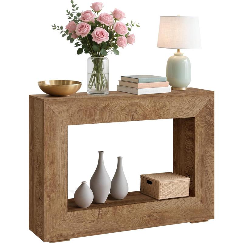 Elevate your entryway or living room with this console table, skillfully blending rustic farmhouse warmth with sleek industrial lines.Its rich burnt wood brown finish and natural wood grain create a vintage yet contemporary focal point, adding unique character and a welcoming atmosphere to any space.