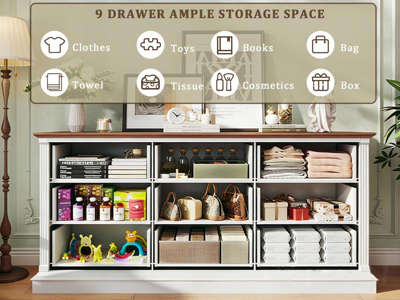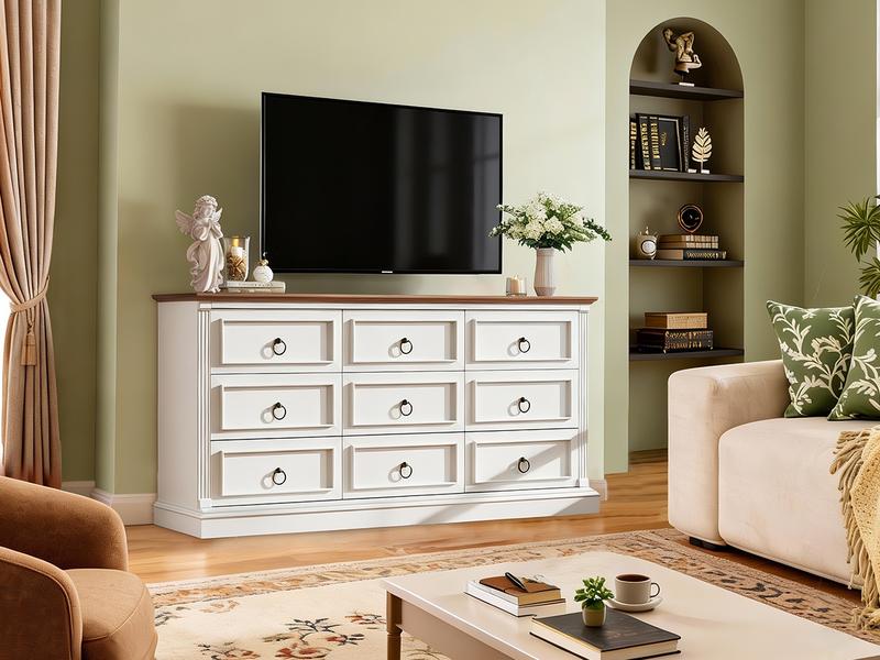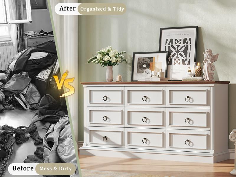 ·Elegant Farmhouse 9-Drawer Dresser: This 9-drawer dresser seamlessly blends rustic farmhouse charm with timeless Roman column details. Featuring a walnut-finished top, antique bronze circular metal handles, and a crisp white finish with an elegant embossed texture, it complements modern, rustic, and mid-century interiors, adding warmth and sophistication to any room.