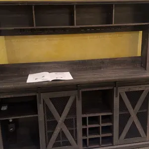 ·Sliding Barn Door Wooden Coffee Bar Cabinet:The classic barn and iron mesh sliding door blends farm and industrial styles, quality sliding track ensures quiet and smooth sliding.our Wooden coffee cart station use distressed knife cut grain craftsmanship, chic industrial and farmhouse styles, unique Sliding Barn Door designs, and antique board finishes to provide a natural aging feeling, creating a comfortable and rustic atmosphere.Matte iron-toned metal accents add a sophisticated edge, enhancing its overall visual.