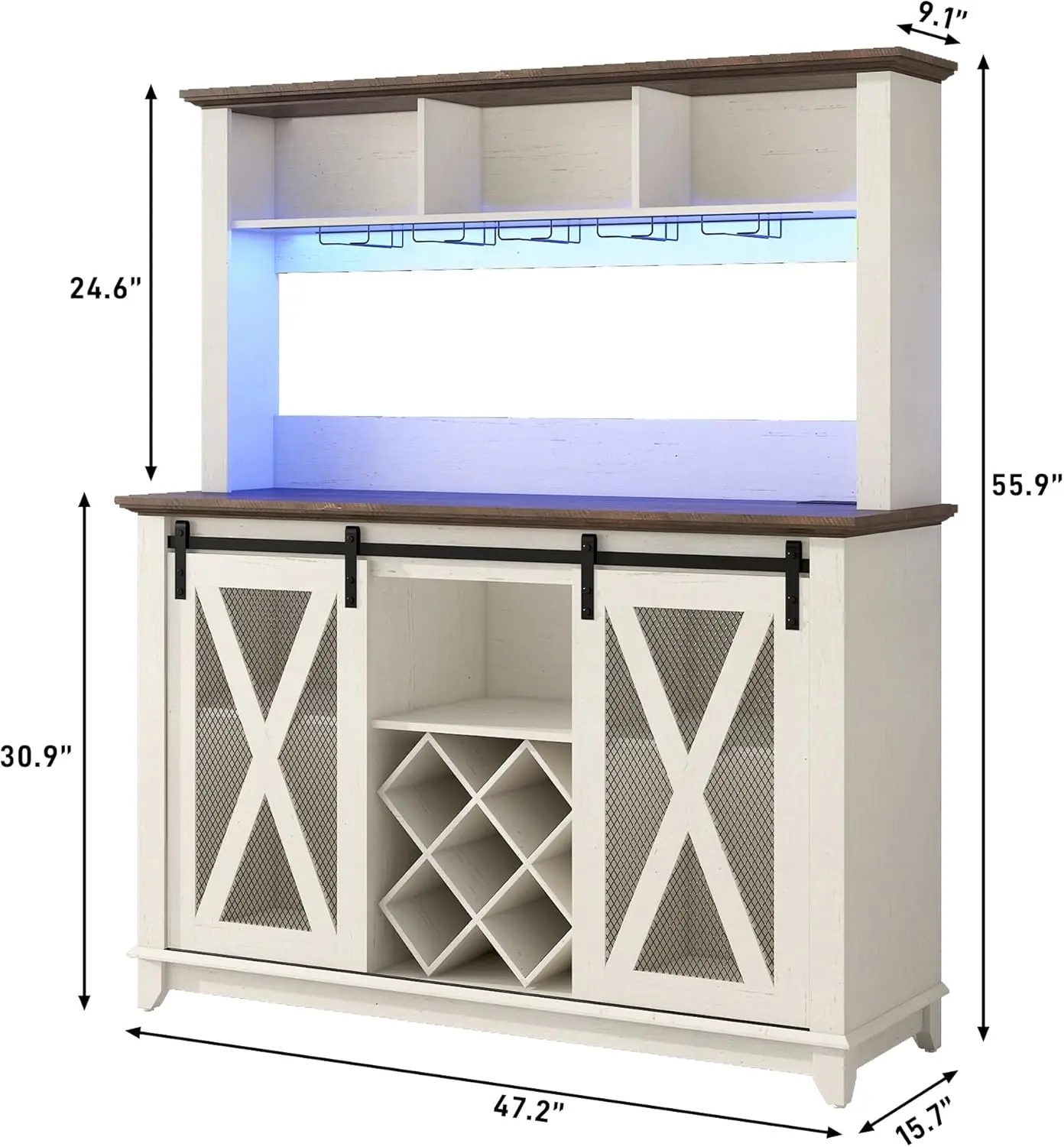 ·47"W Farmhouse wine cabinet Size :15.75"D x 47.2"W x 55.9"H.Larger in width and height.The spacious center tabletop is perfect for coffee maker,bread machines,cutlery etc.The 3-layer open storage compartments above are perfect for coffee beans, cups, jars, etc.The glass rack can hold 10-15 glasses, and the 15-grid wine rack can easily and orderly store your wine.