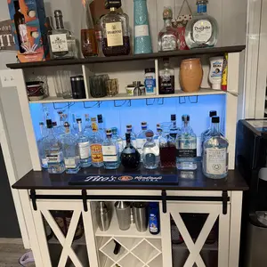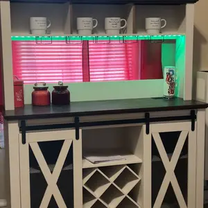 ·Coffee Bar Cabinet With LED Lights:this 63"W farmhouse coffee bar cabinet Equipped with an RGB LED light strip,by Mobile APP and Remote control to control LED lights.the light strip that can adjust 60,000 RGB colors, with color, brightness, and mode adjustment functions, music synchronization function, and timing function.which is perfect for wine tasting, parties, and showcasing wine collection.