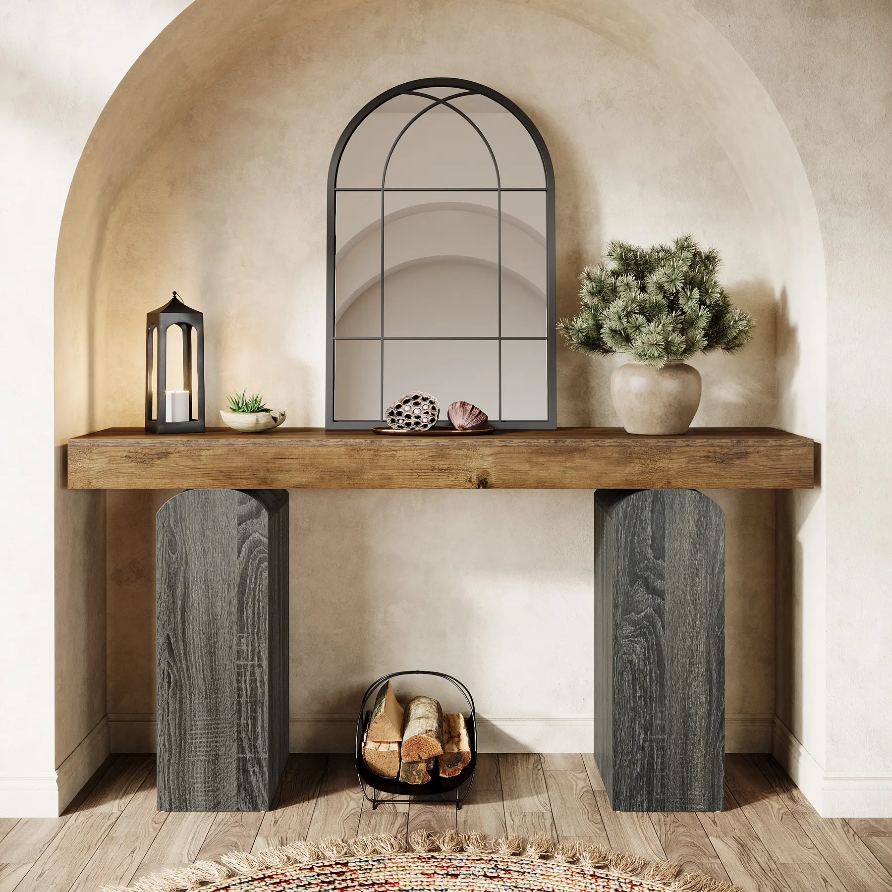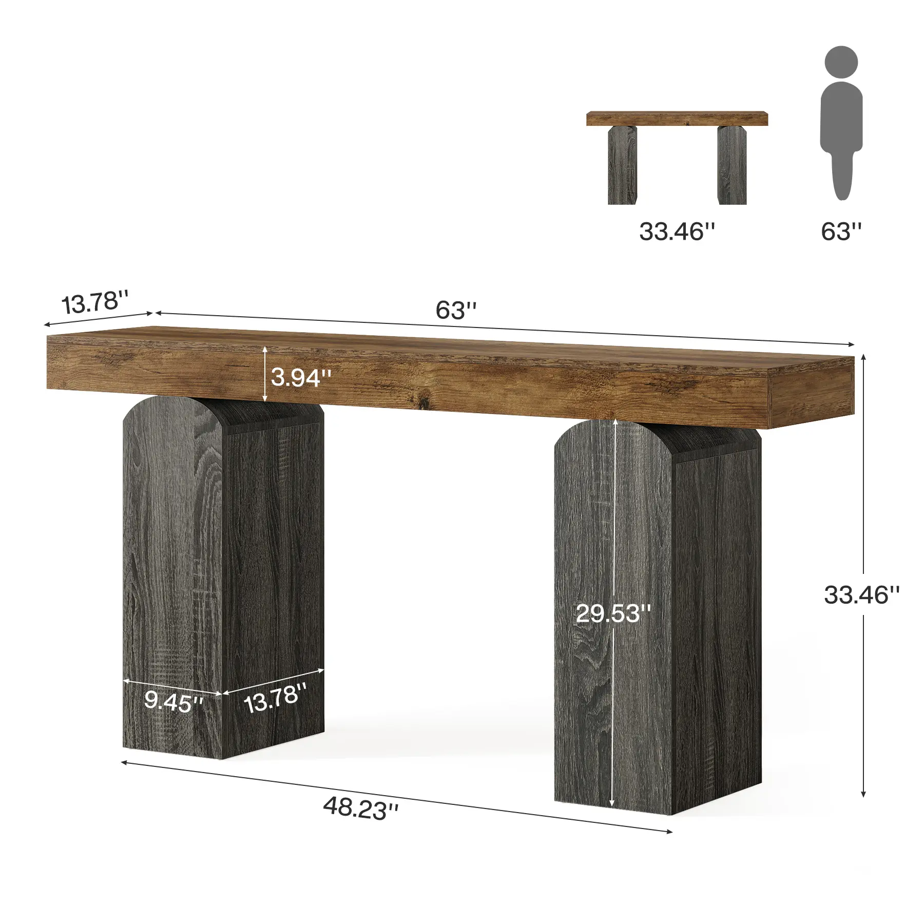 ·Two - Tone Farmhouse Aesthetic: 63" long console table blends rustic brown - grain tabletop with vintage gray - grain arched pedestal legs. Captures farmhouse charm, adding unique style to entryways, living rooms, hallways. Creates eye - catching two - tone look for any decor