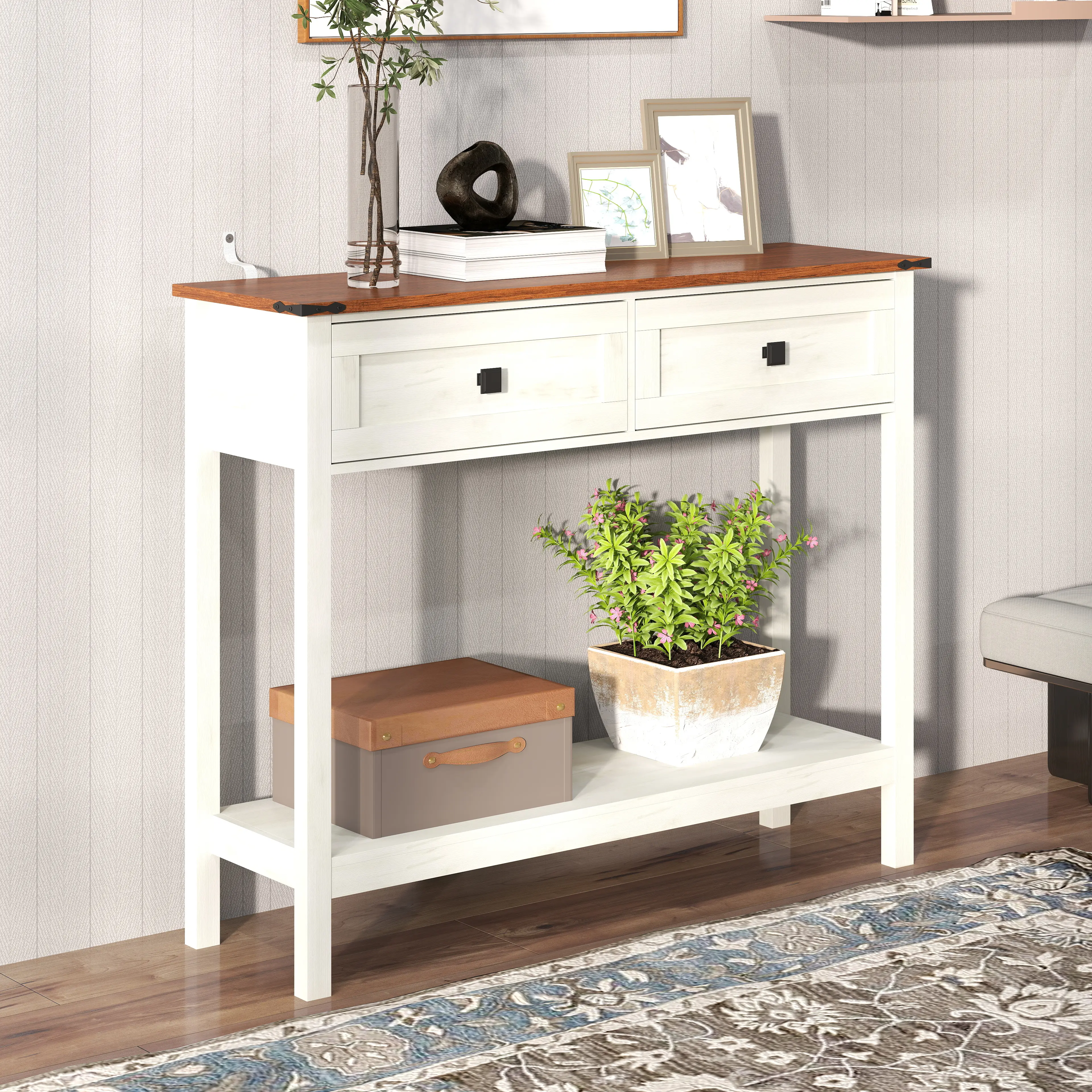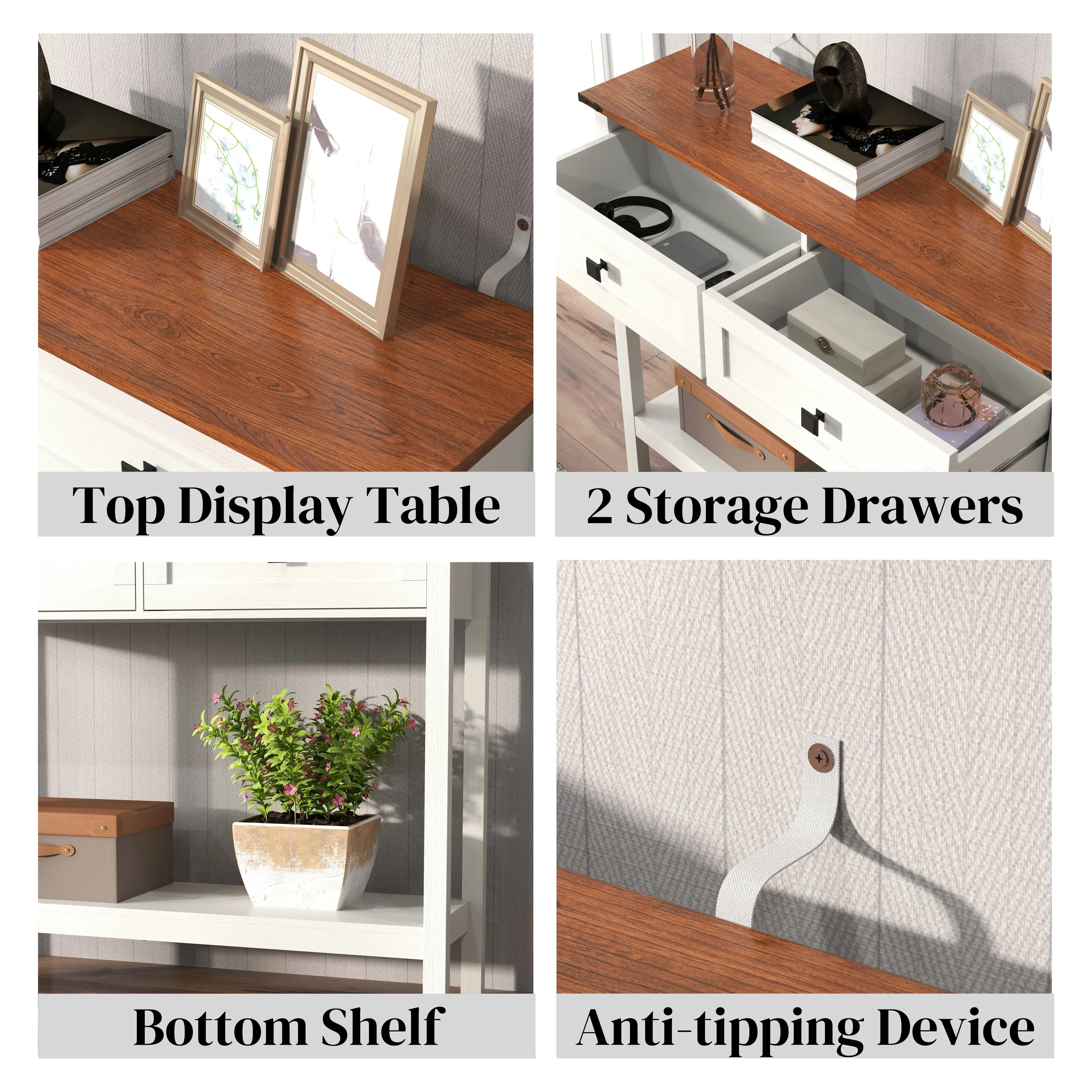 Manual measurement has been used, there may be some reasonable deviation.Dual-Tone Artistry: Antique white and rich brown woodgrain create a dynamic, adaptable visual rhythm for diverse décor themes.Entryway Command Center: Streamline clutter with dual drawers (hidden storage), a display-ready desktop, and an open shelf for bulkier items.space clean and tidy.Metal Accent Elegance: Brushed-metal handles and corner protectors blend rugged charm with upscale polish.Multi-purpose usage:The 4 legs storage table can be used as a console table, sofa table, entry table, small TV table, coffee bar table or display stand in your bedroom, living room, dining room.Saving a lot of space for your living space.Instant Sophistication: Tool-free assembly in under 30 minutes—ideal for renters or design enthusiasts craving instant gratification.