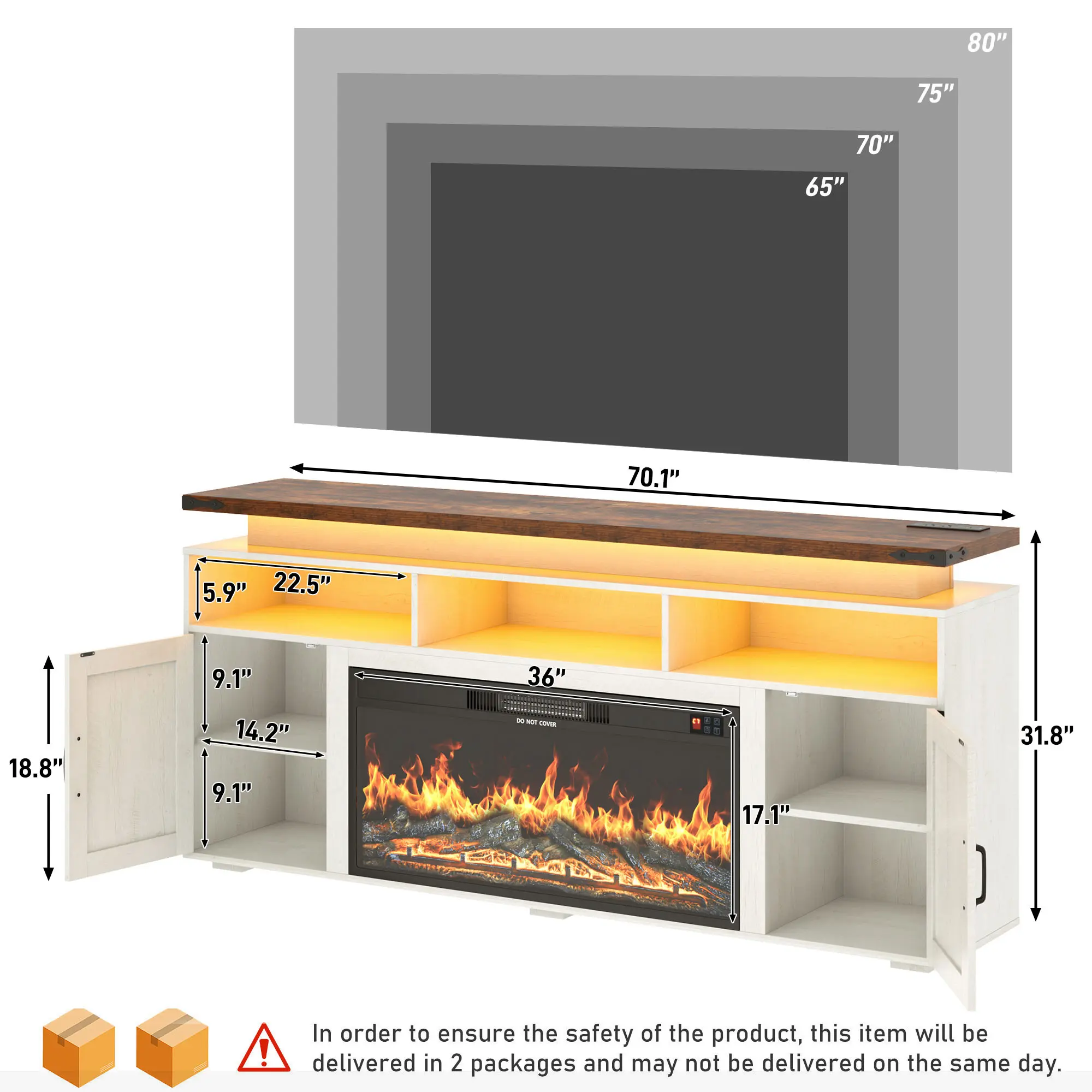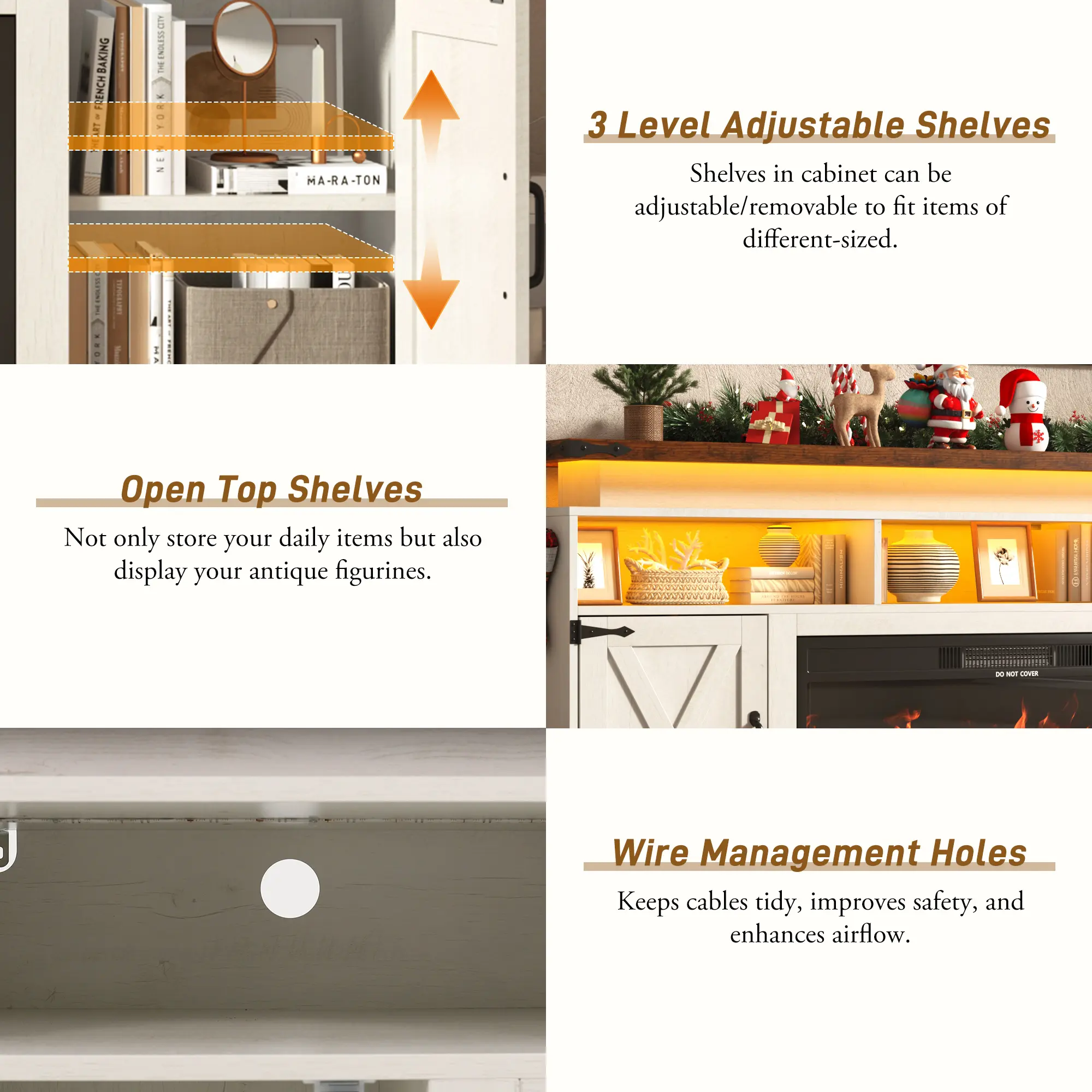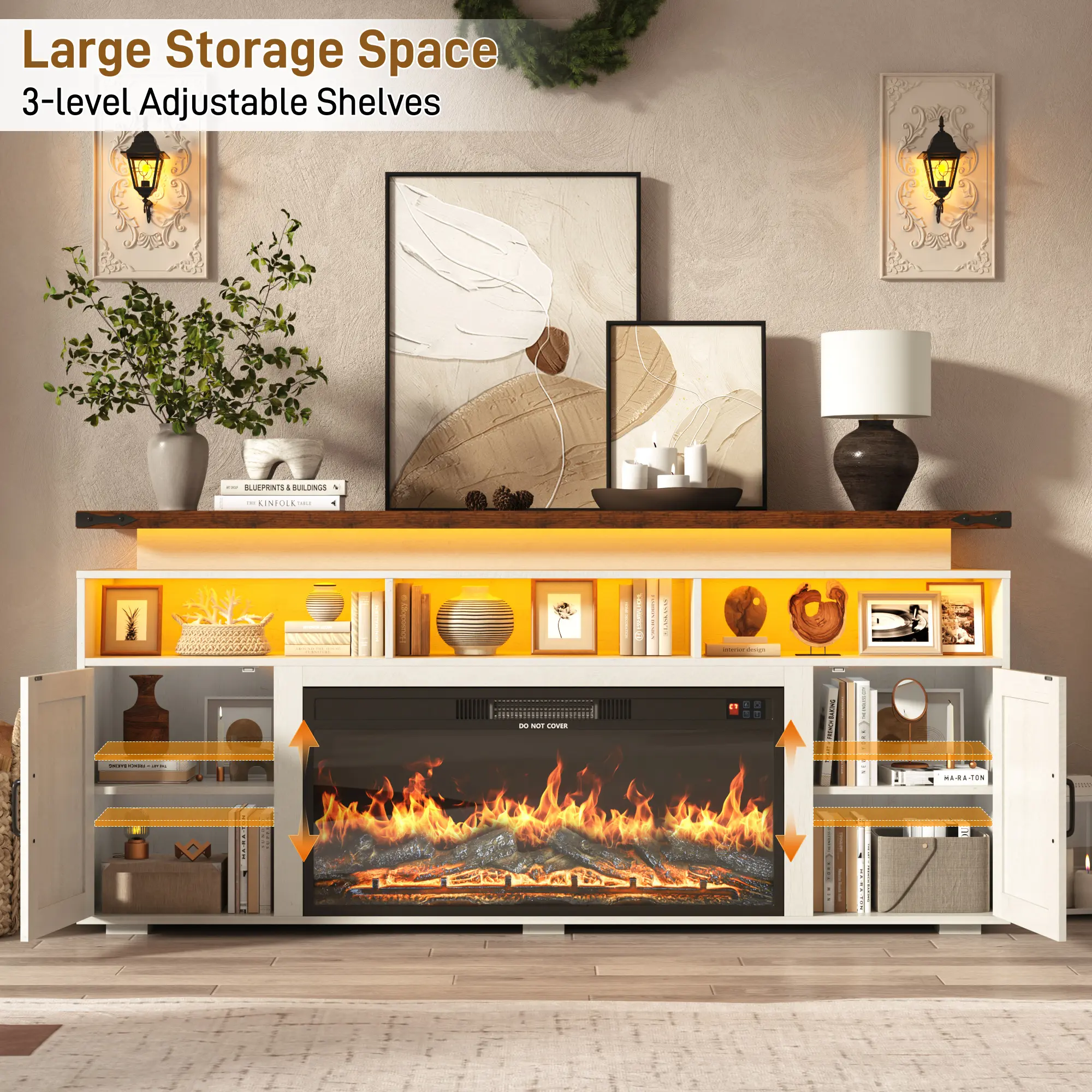 Sturdy MDF Build with Reliable Safety Protection: Designed with reinforced double top panels, this unit supports up to 300 lbs with confidence. Smooth, quiet rails and soft-close hinges help prevent finger pinches. The fireplace incorporates built-in overheat protection and meets ETL/FCC safety certifications, providing dependable performance and peace of mind.