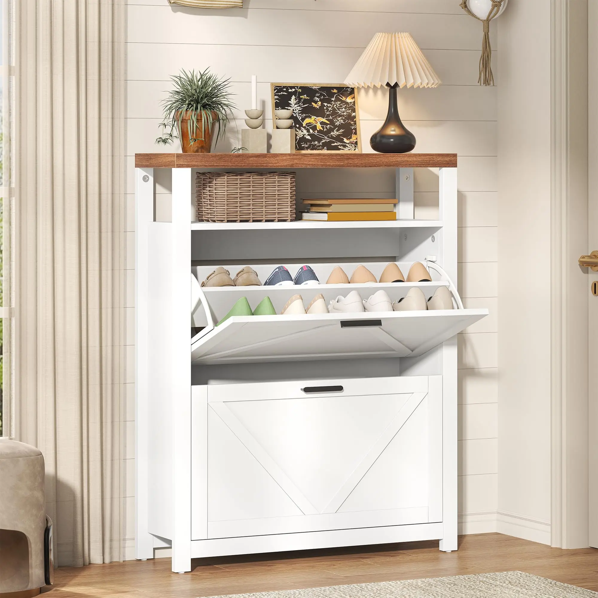 ·Spacious Storage: The shoe storage cabinet can hold a maximum of 32 to 40 pairs of shoes. Each shoe storage space with flip drawers has 2-tiers inside, and the removable shelves can meet you and your family's storage needs for a variety of different sizes or styles of shoes.
