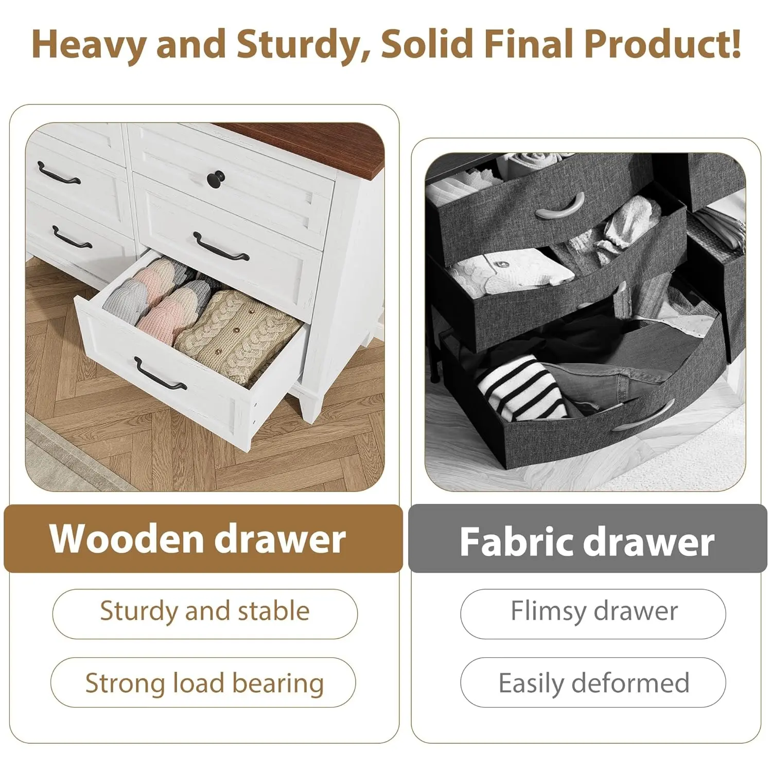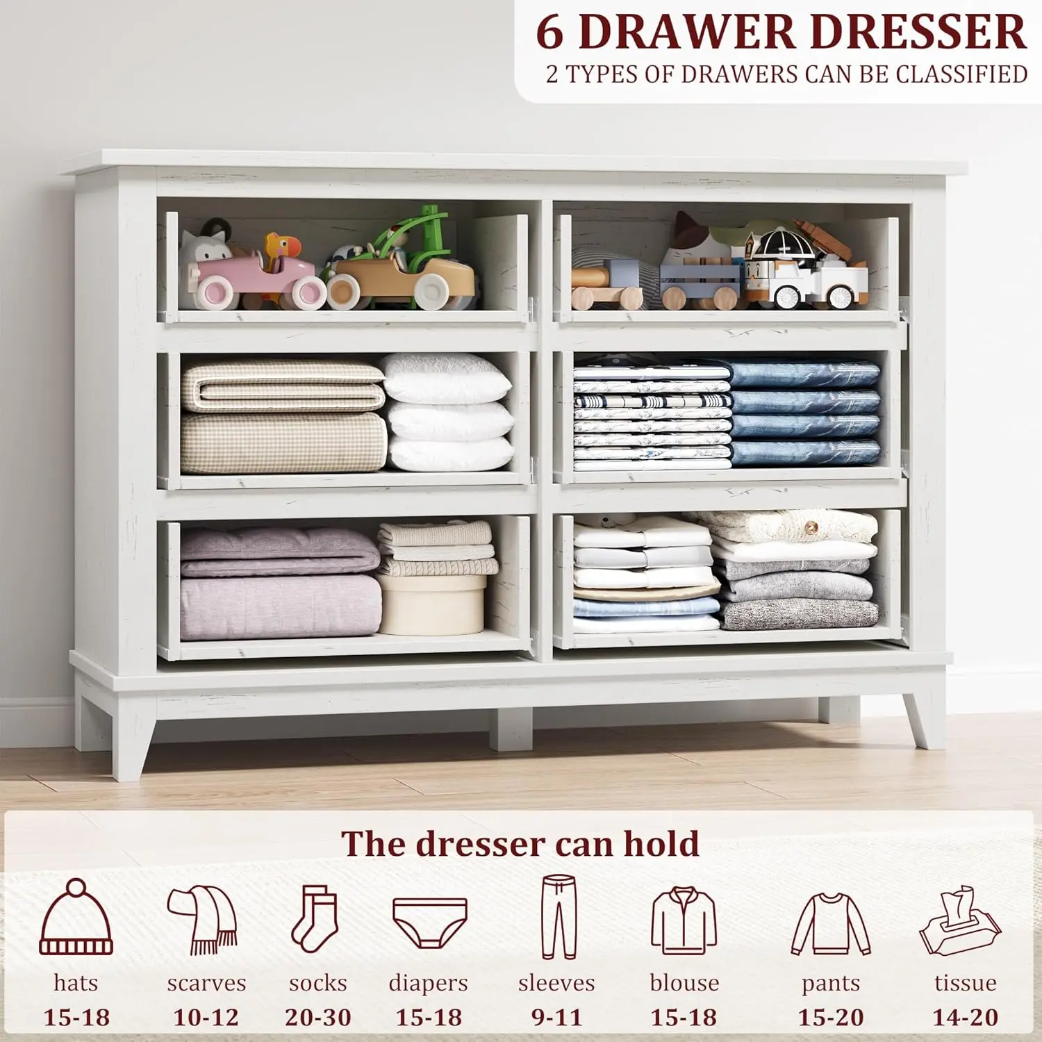 Our 6-drawer dresser offers abundant storage, featuring 6 ultra-deep drawers to accommodate all your daily essentials. The spacious desktop provides the spot for small items, lamps, and ets, allowing you to conveniently showcase and enhance your room's decor style