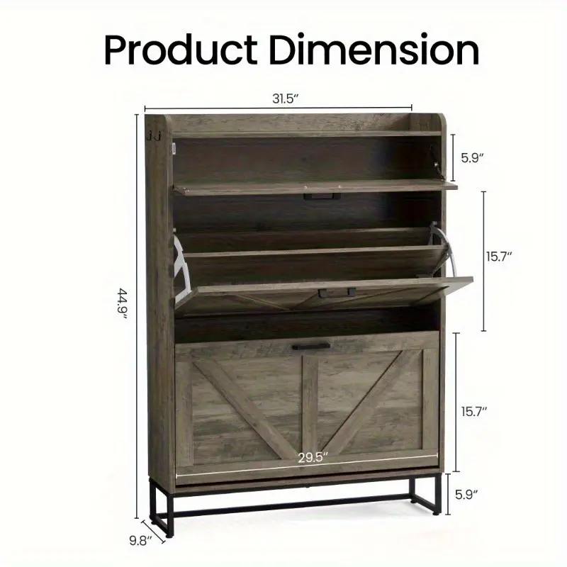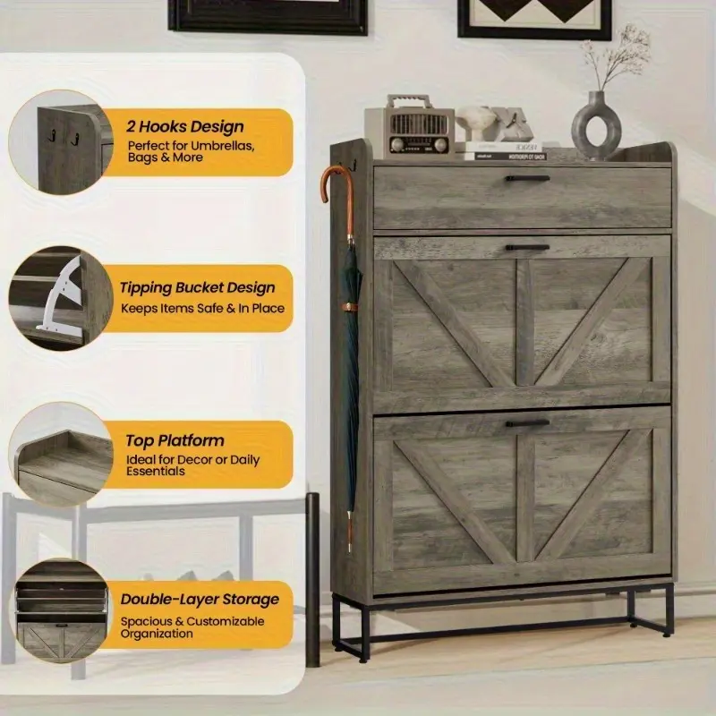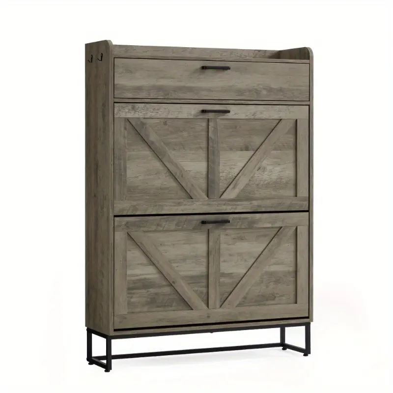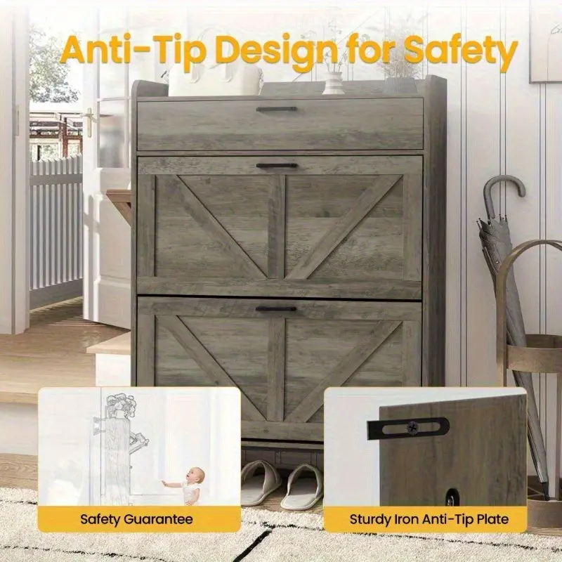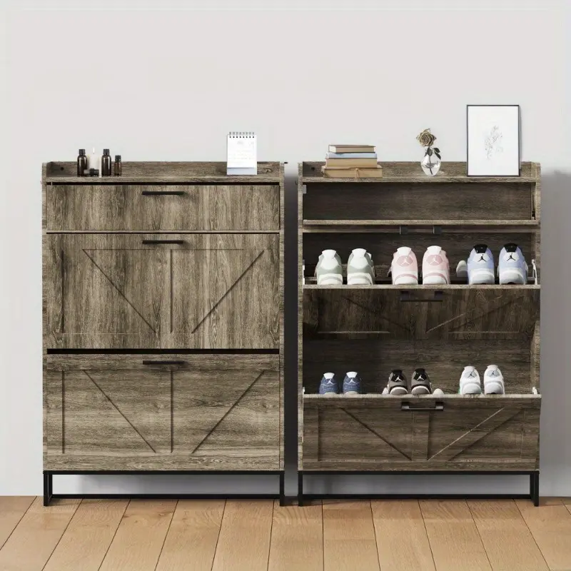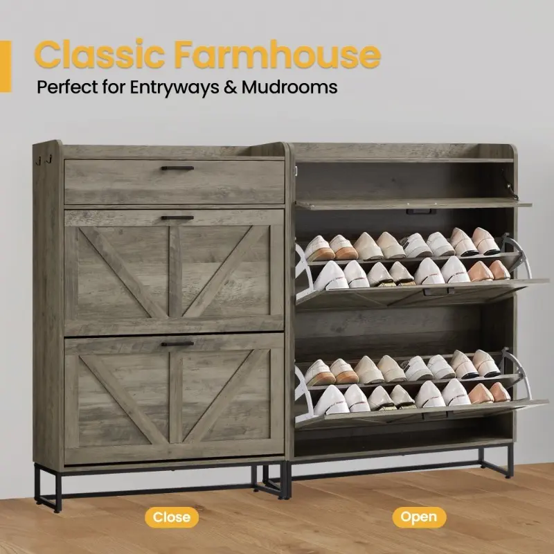 The farmhouse - style flip - top shoe cabinet is a must - have for entryway storage. It mixes function with farmhouse charm, fitting any decor.Its flip - top design eases shoe access and oozes rustic appeal. The multi - layer, spacious interior stores many shoes, keeping your entryway tidy.Made of quality wood, it's heavy - duty and long - lasting. The distressed finish brings an authentic farmhouse style, adding unique charm.