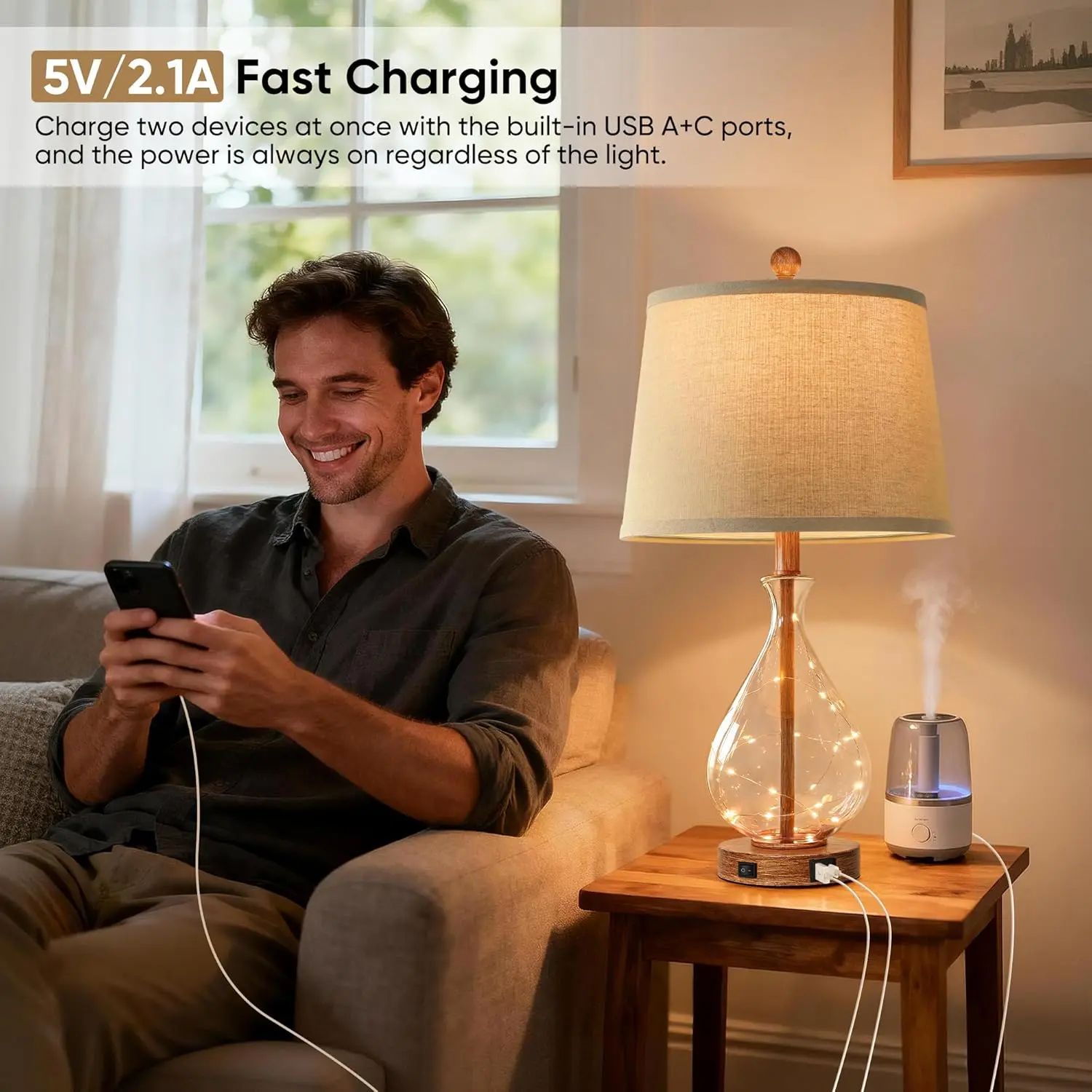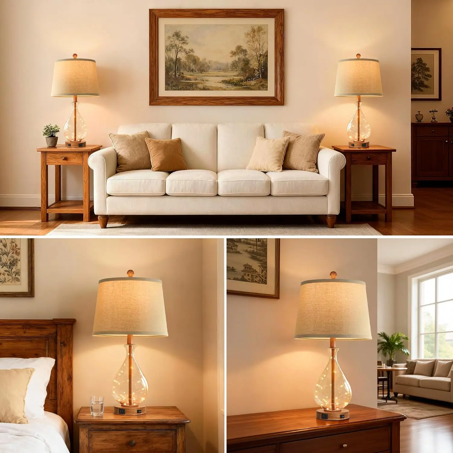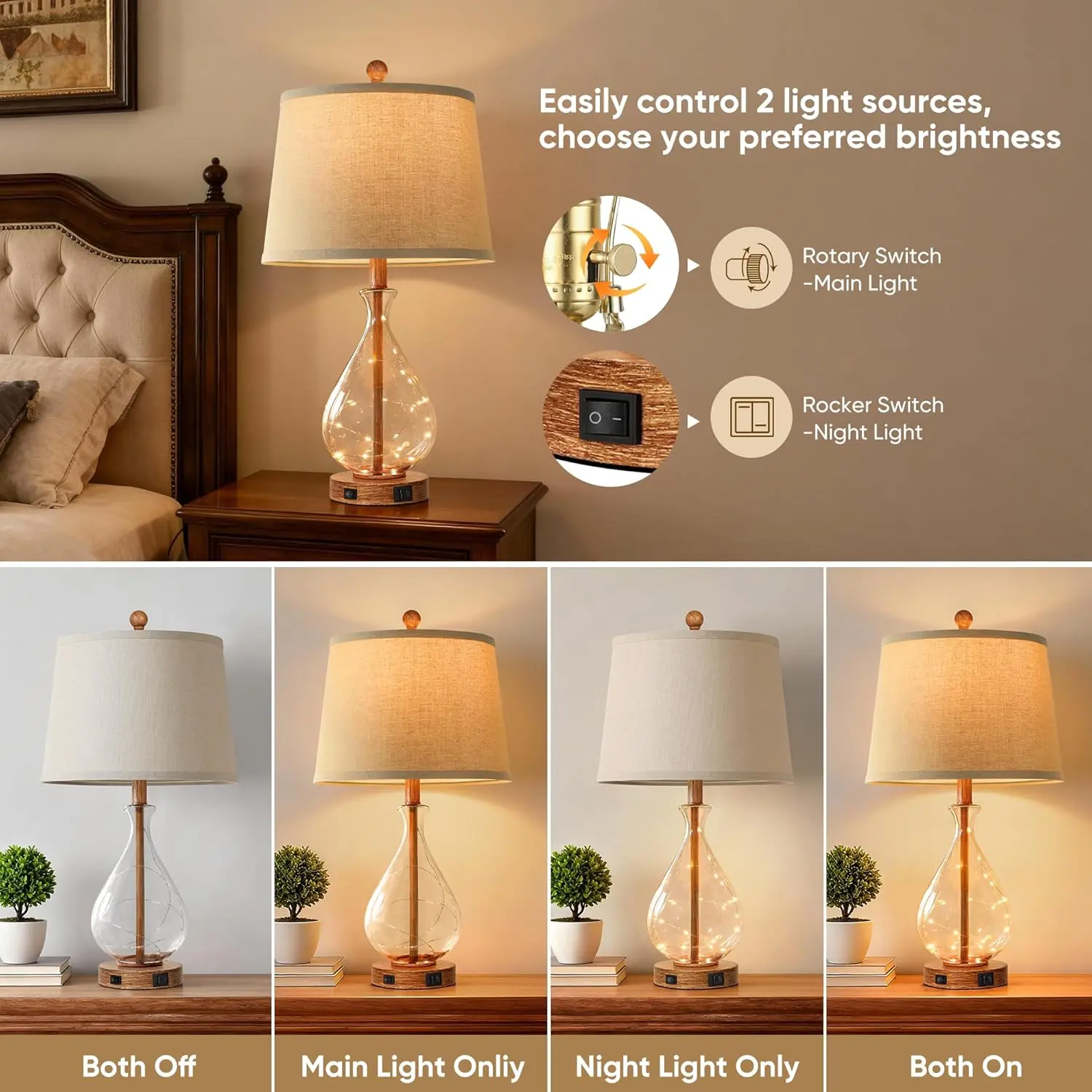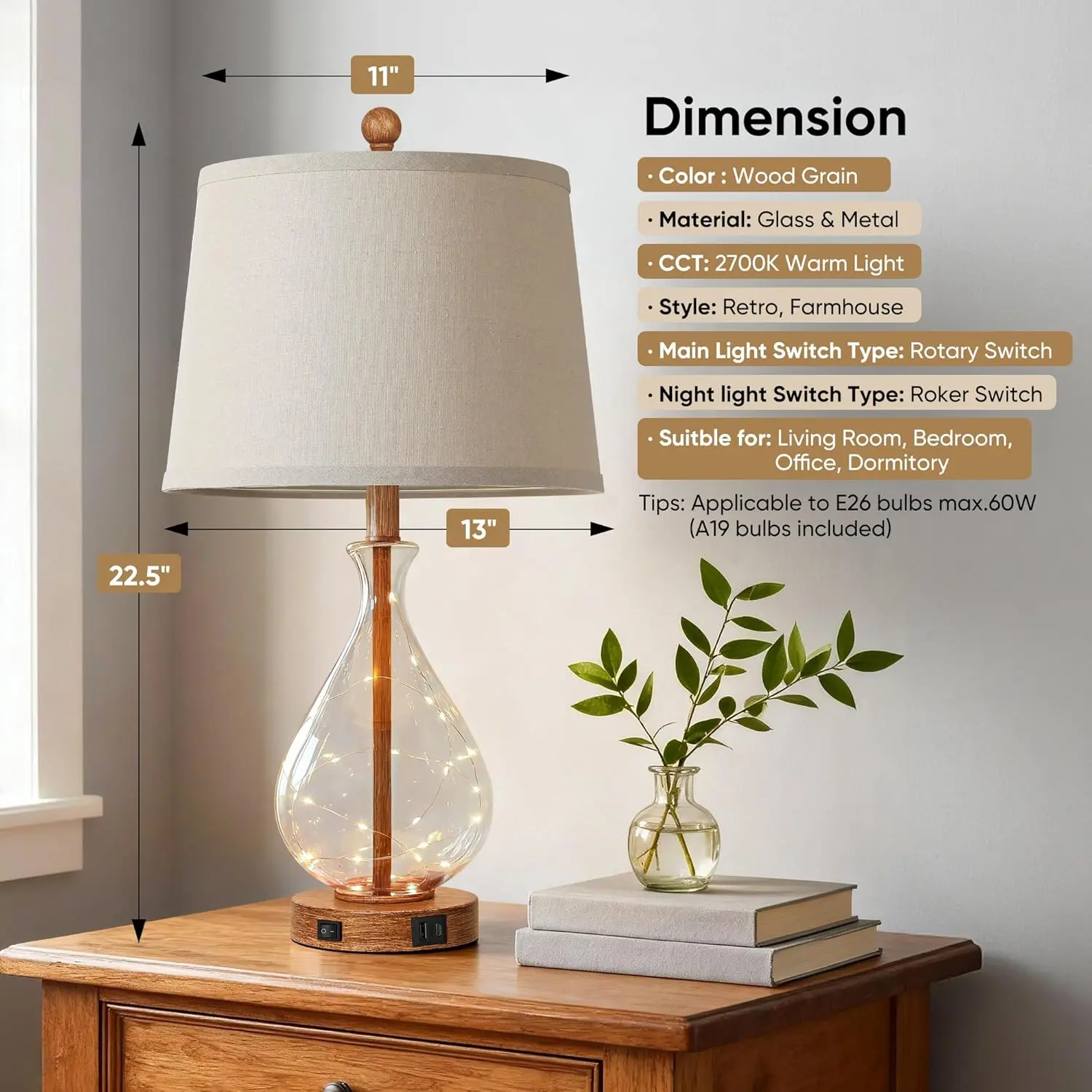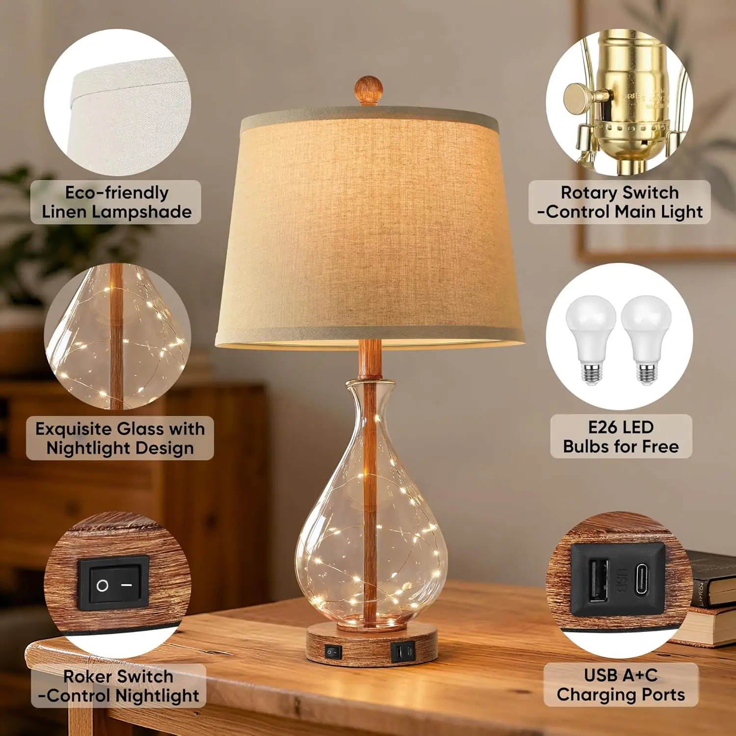 1. Unique Rustic Farmhouse Design: The table lamps for bedroom feature a glass body with a brown wood-grain finish. The bedside lamp is topped with a linen shade that adds a touch of natural texture to your space. Featuring some small light strings inside the lamp body, which look like fireflies, creating a warm and inviting ambiance.