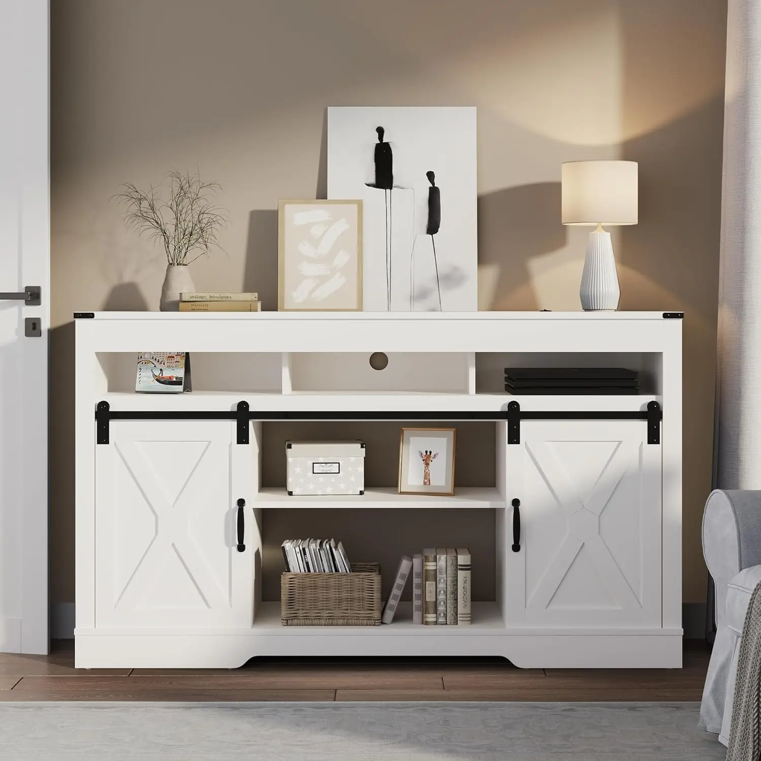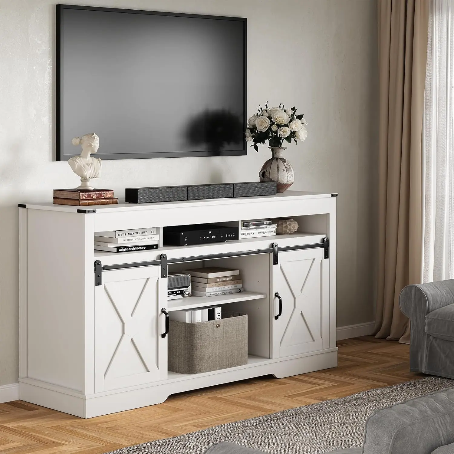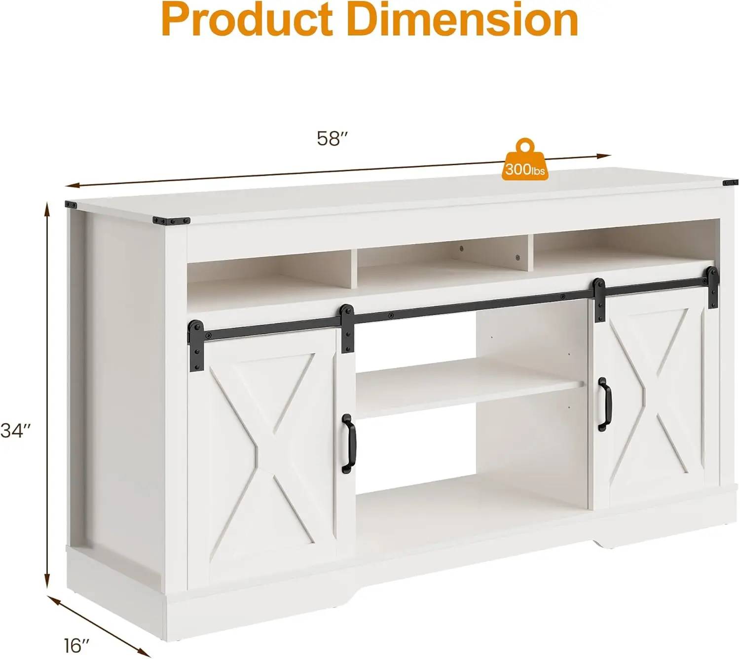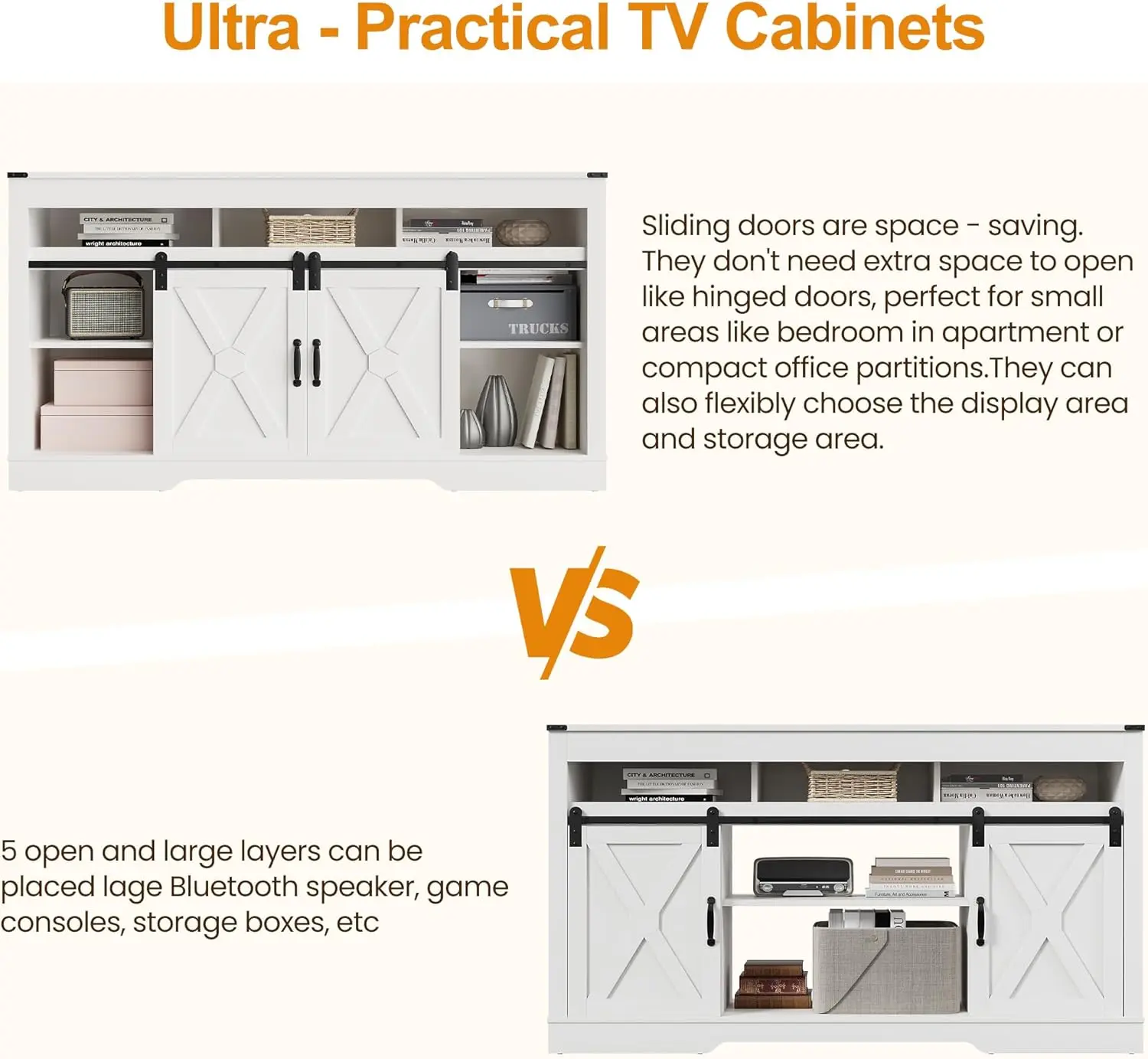 ·34'' Tall Entertainment Center: It can fit into smaller rooms or corners without taking up too much floor space. It is very suitable for a small apartment or a dormitory room where every square foot counts. Additionally, you can adjust the barn doors to any position to meet your private storage needs.