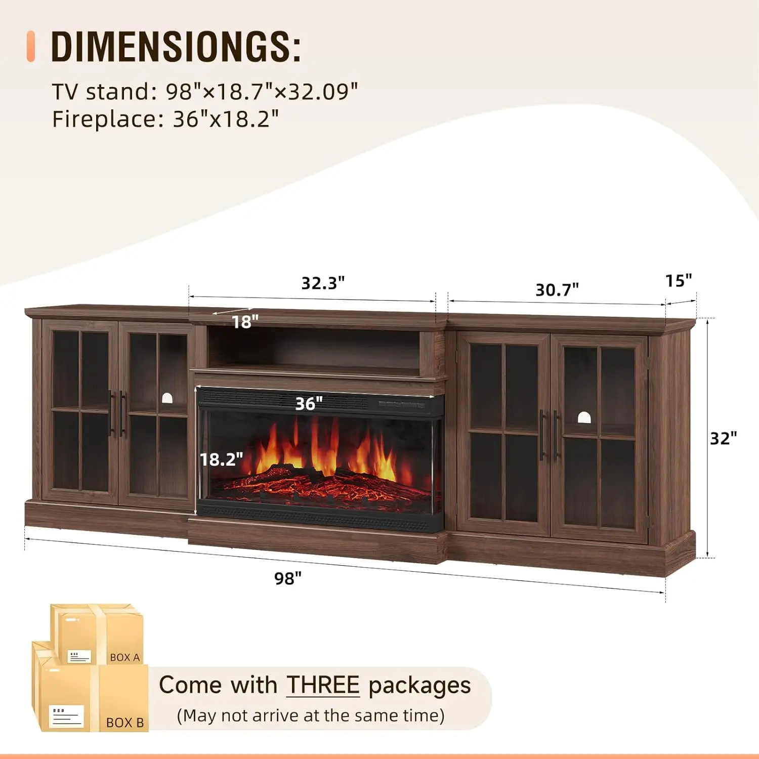 Illustrated assembly instructions are provided for both the TV cabinet and fireplace. Installation is relatively easy. The product is packed in several packages and may arrive at different times. 📦