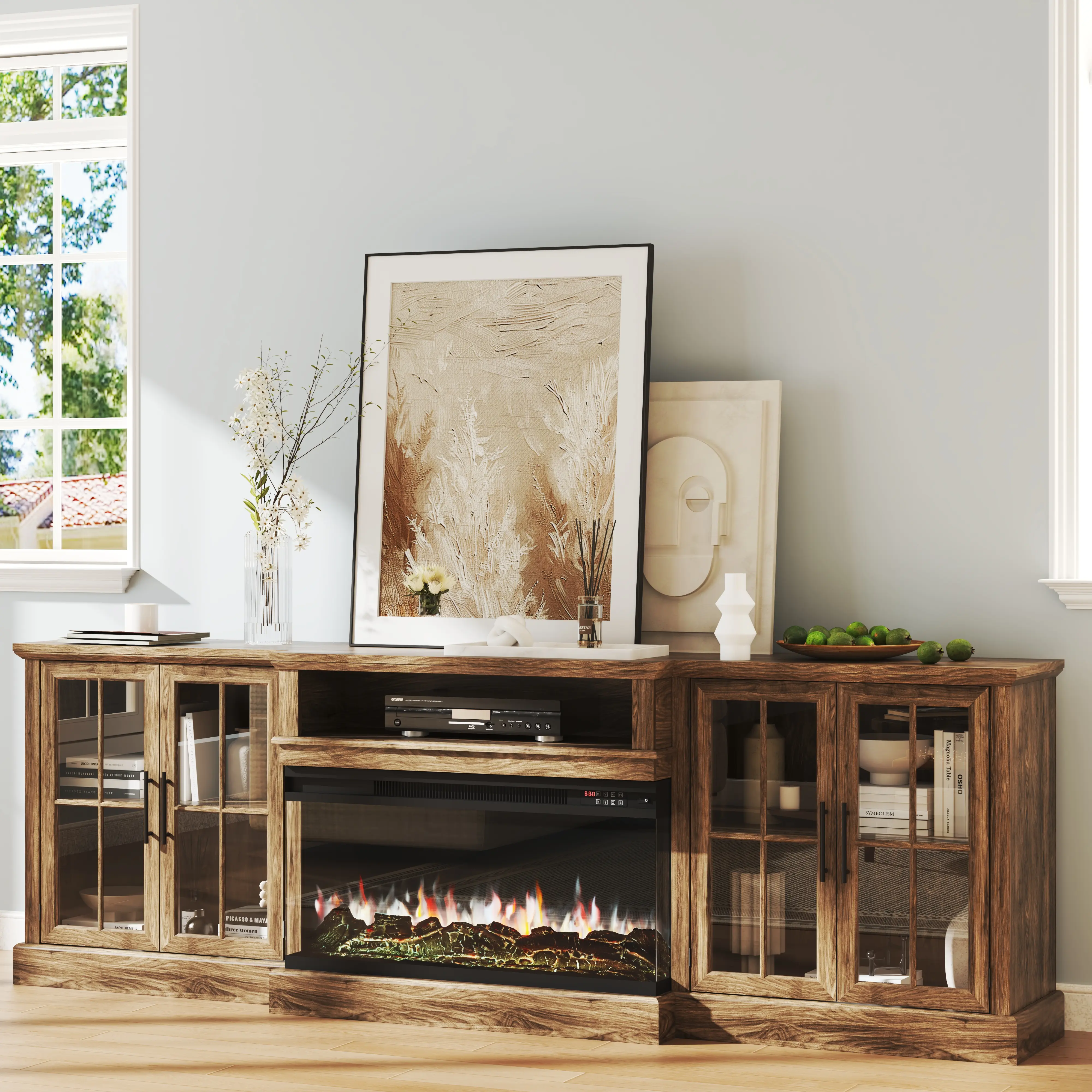 The fireplace TV stand offers a panoramic 180° view of the flames from three sides. It has 5 flame brightness settings, 12 backlight colors, and 12 LED light strips. You can adjust the temperature from 60°F to 99°F and set the time from 0.5 to 9 hours. 🔥