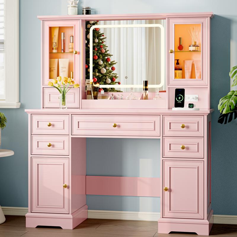 ·【3 Lighting Modes & Brightness Adjustable】The white/black/pink/grey vanity features a large LED mirror, providing 3 color modes (warm/natural/cool) and brightness adjustable. The vanity desk can meet all your different needs, perfect for home makeup, salon, and live broadcast. So you can experience the star-like makeup treatment