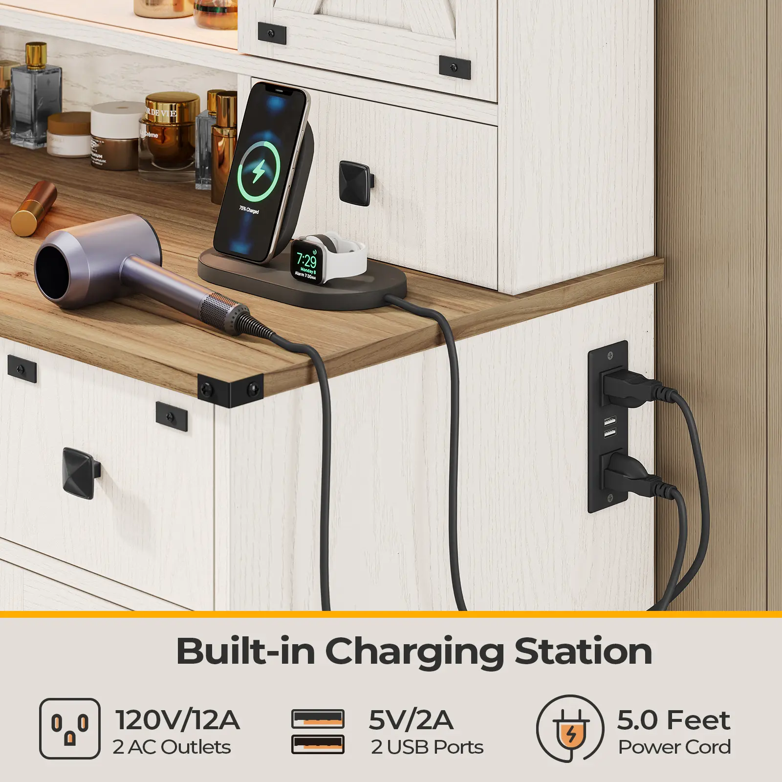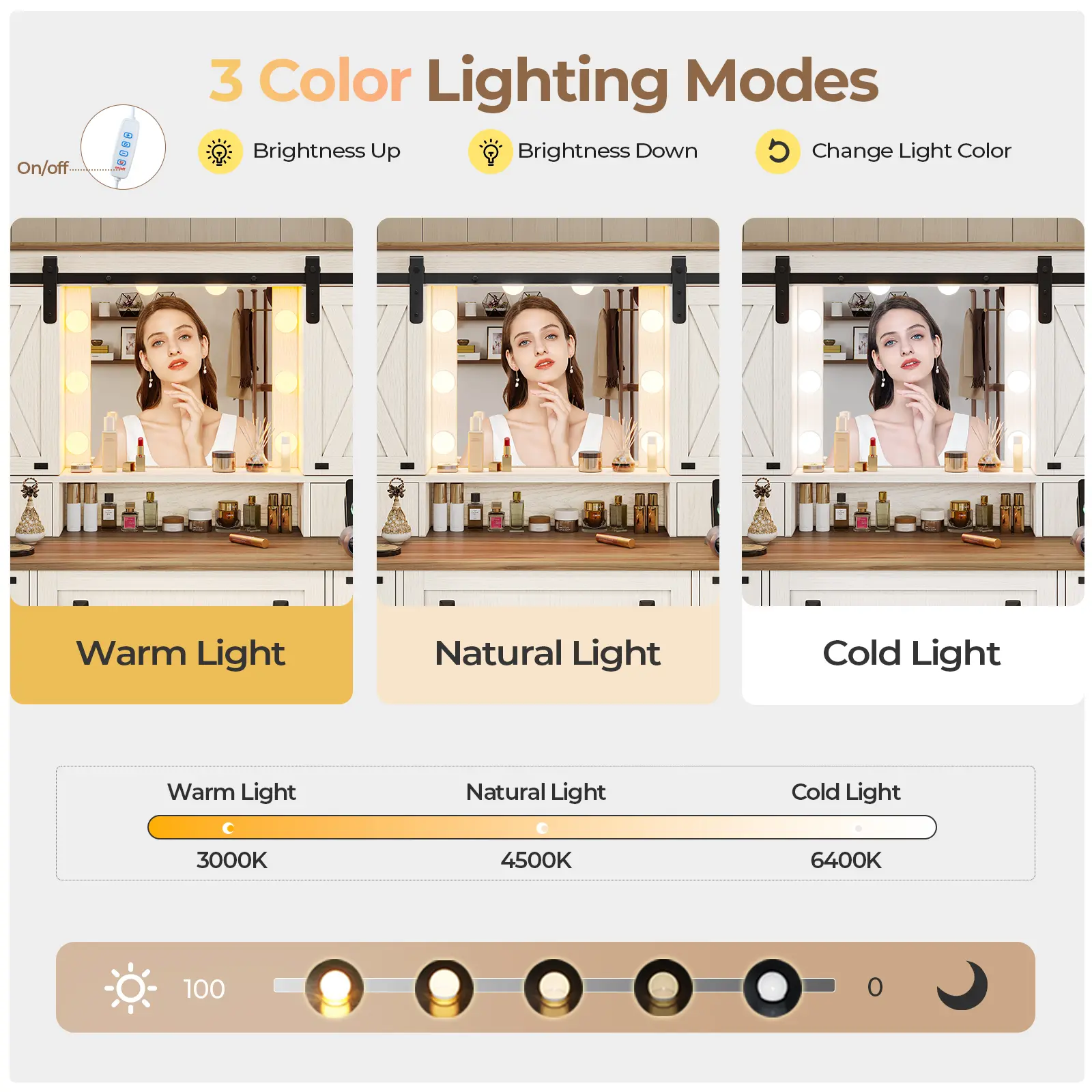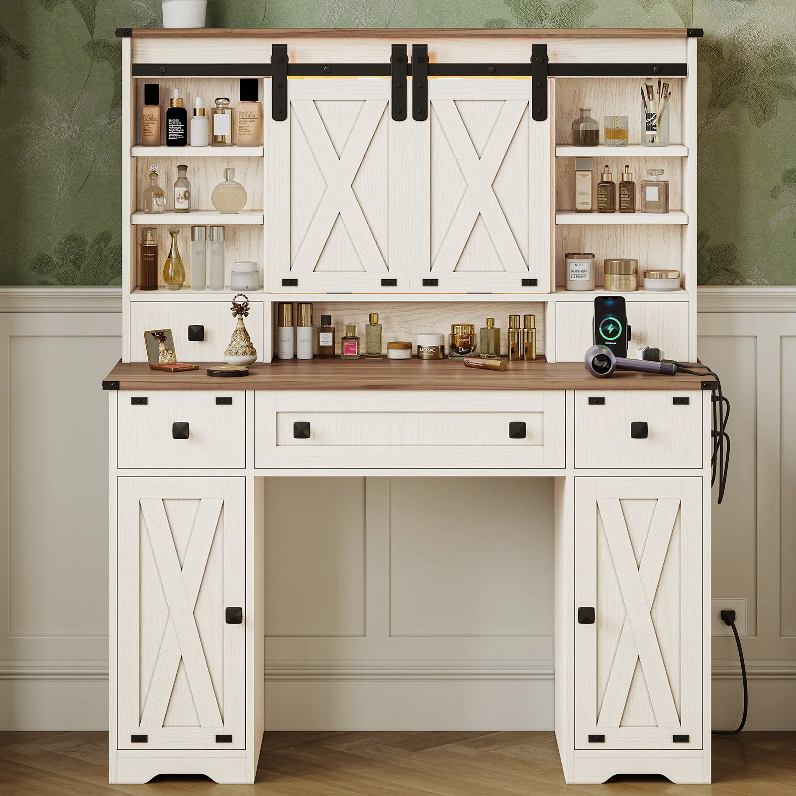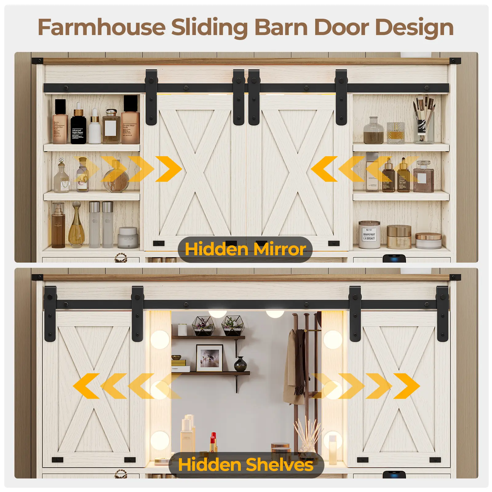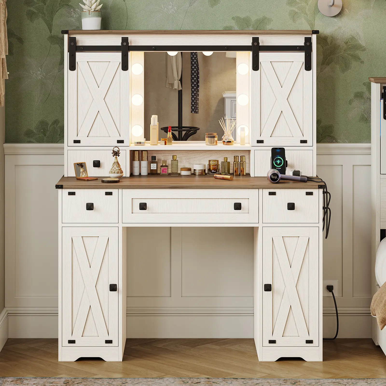 Modern Farmhouse StyleBarn Doors, vintage metal accentsand FSC-certified wood. Tri-Color LED MirrorHollywood Lightswith warm, natural, and cool modes. Built-in Charging Station: Includes2 AC outlets and 2 USB ports. • Plenty of Organized Storage: Includesadjustable shelves, tabletop boxes, sliding door compartmentsDIY grid drawers, and side cabinets Full-extension drawer slidesDrawe rails completely extendedfor easy access and supports heavy items without sagging.