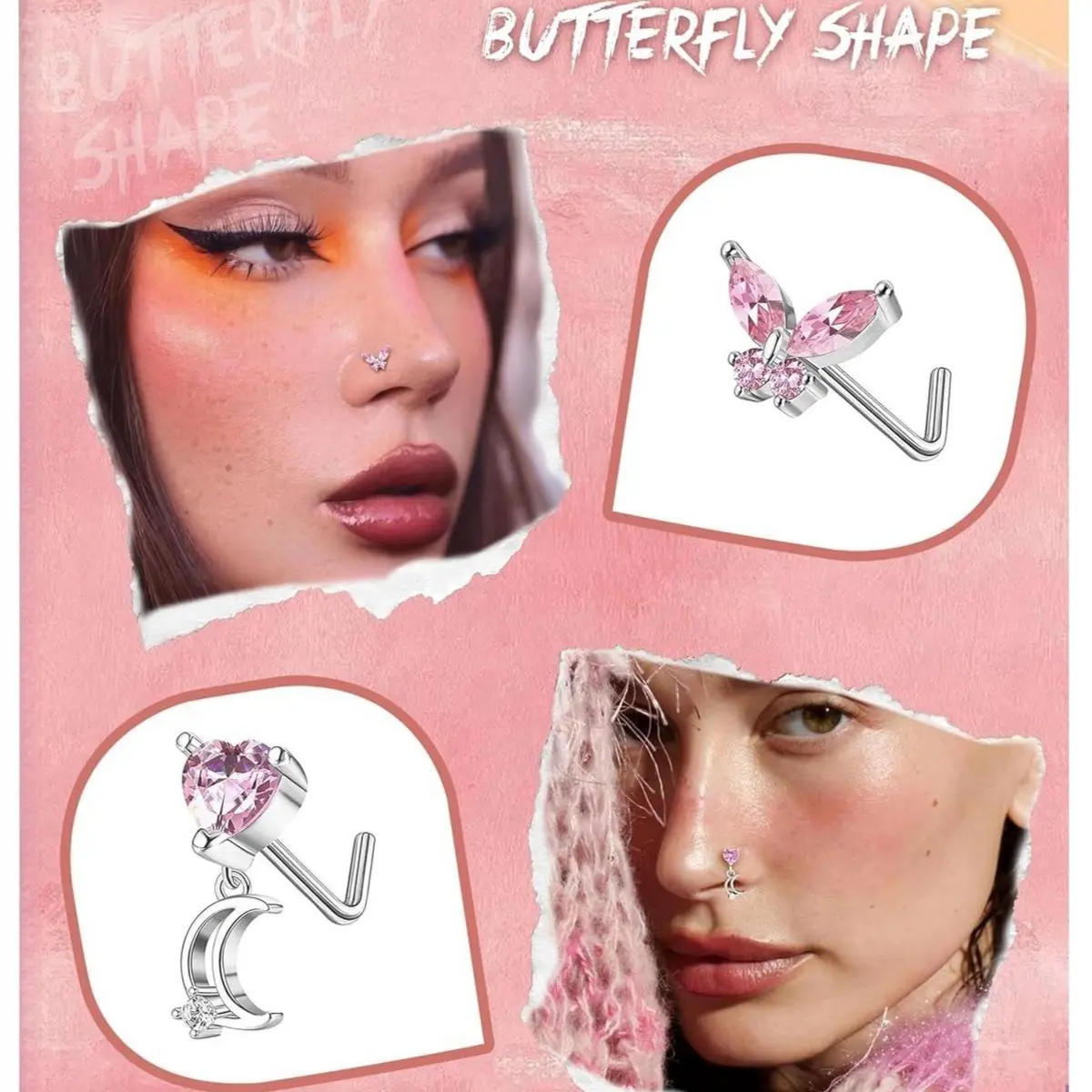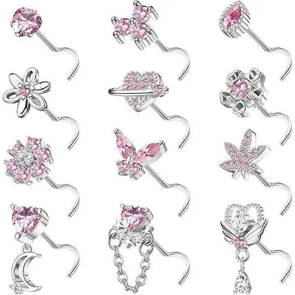 5. FASACCO 12PCS 20G Nose Rings Surgical Stainless Steel L Shaped Nose Studs for Women Men CZ Heart Butterfly Flower Leaf Moon Dangle Cute Nose Piercings Studs Screw Jewelry Pink