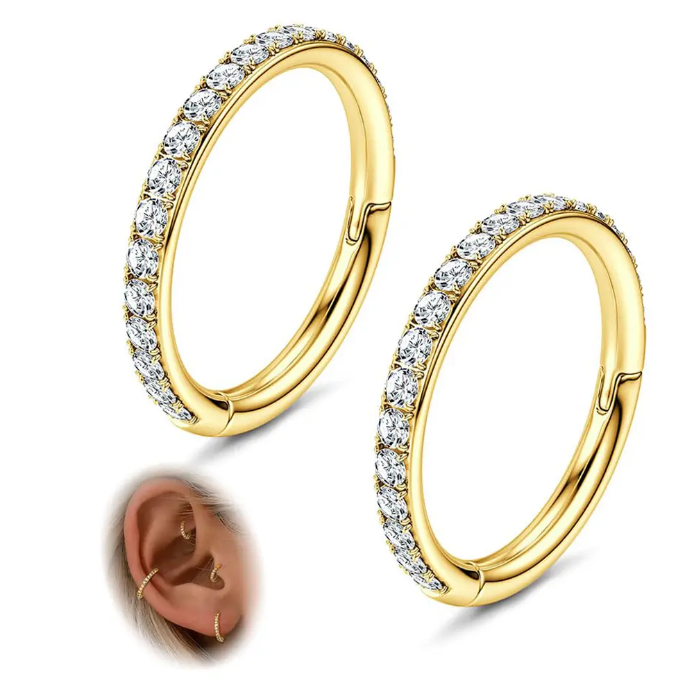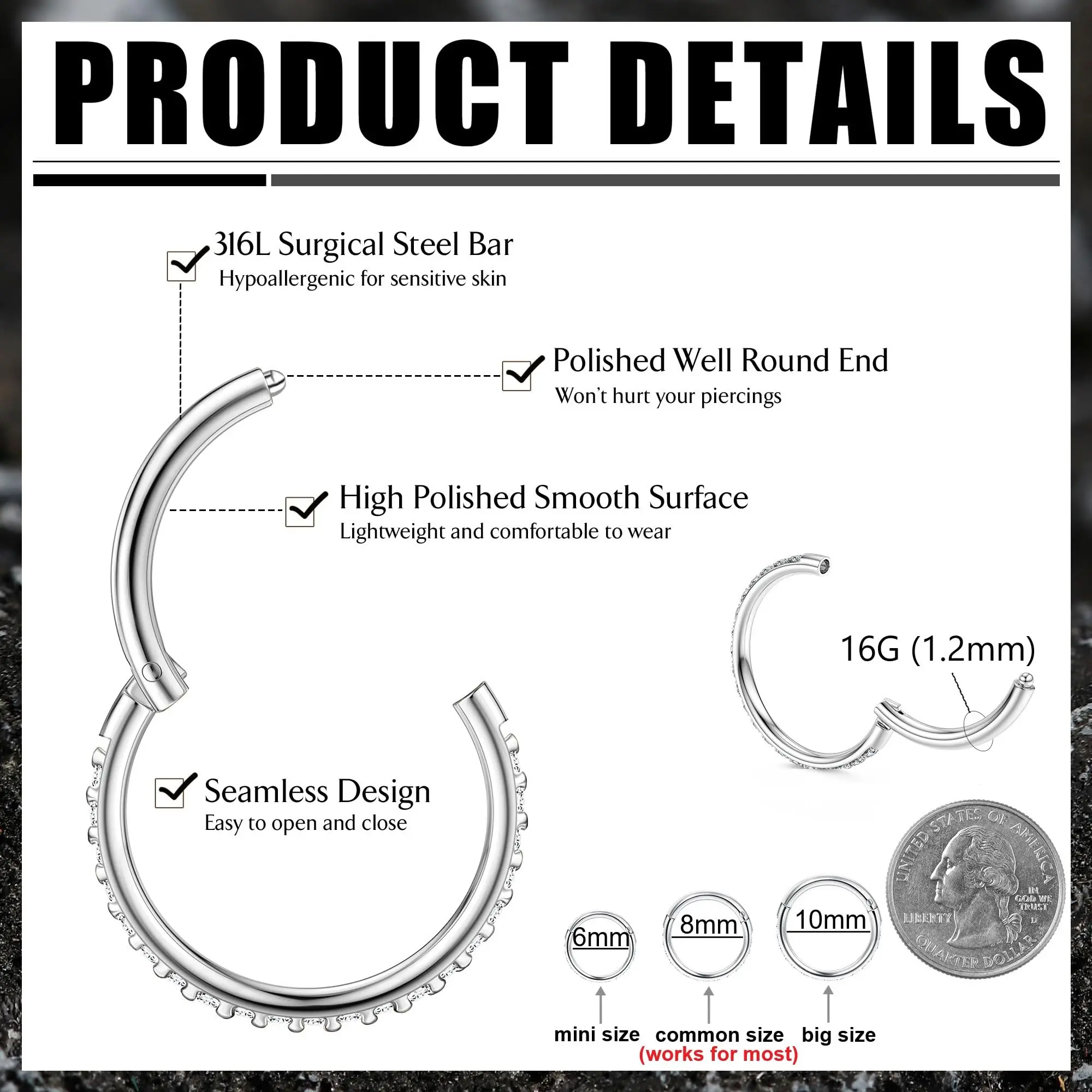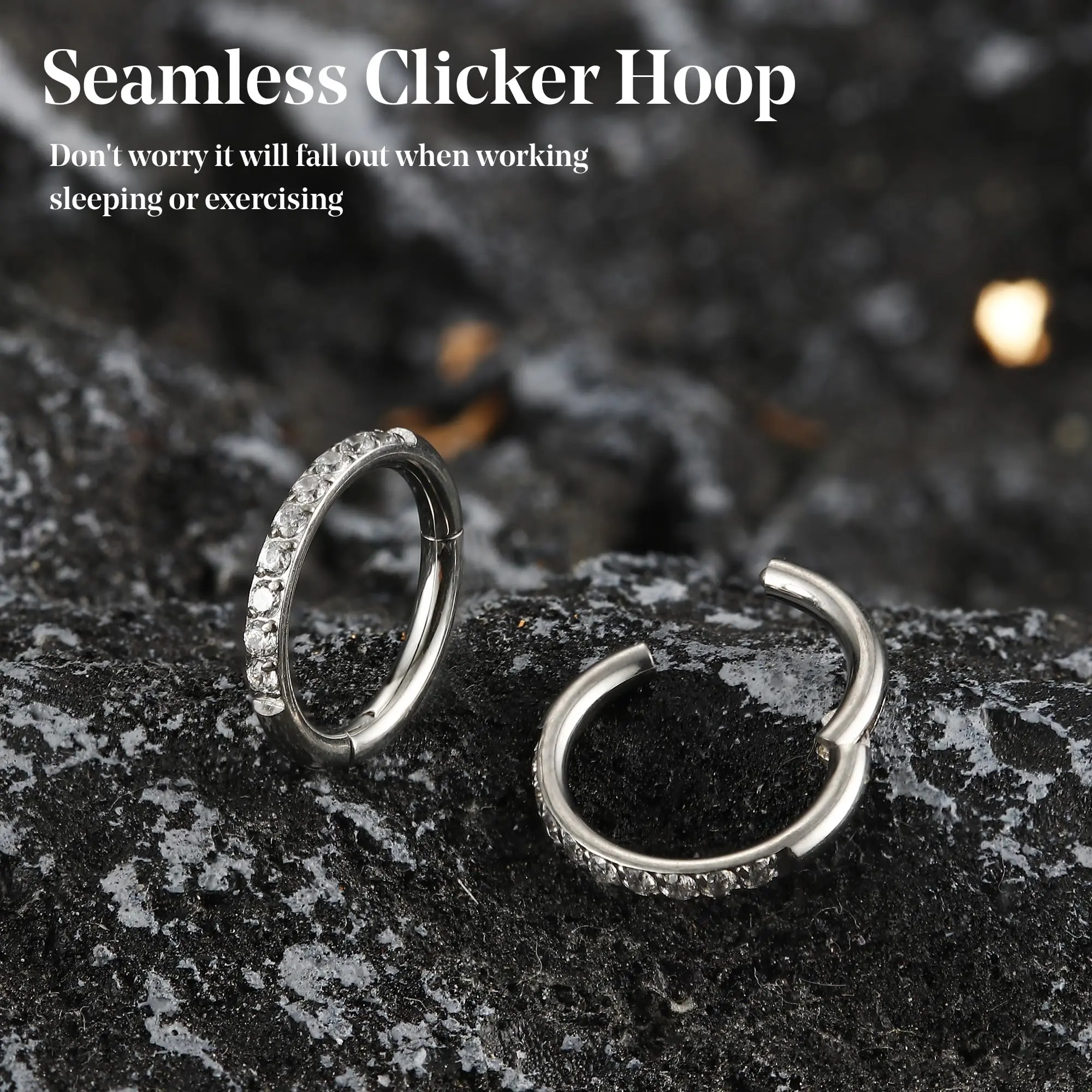 ·QUALITY MATERIAL: The hinged clicker are made of 316L stainless steel, lead free and nickel free, 5A cubic zirconia inlaid, Hinged section will not deformed, tight and secure after long time use, seamless design is safer to wear.