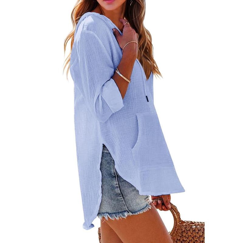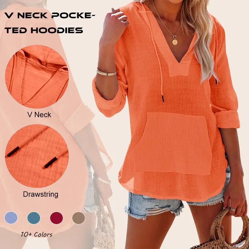 ·Features: Tunic beach shirts for women, long sleeves, side slit, kangaroo pocket, sexy v neck, hooded with drawstring tie, casual and relaxed fit style.